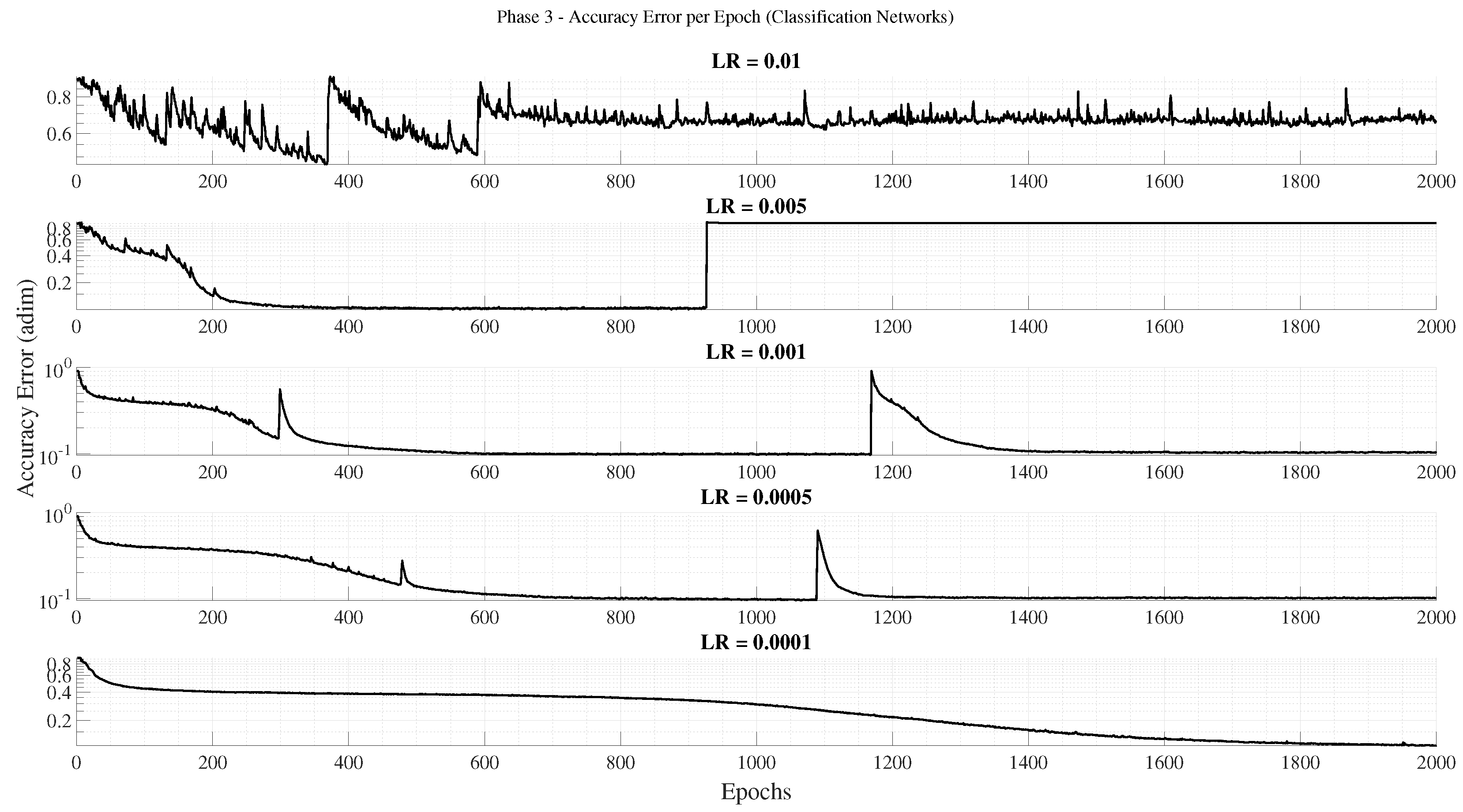 These outcomes reflect the high redundancy and precision of the sensor suite: most samples are highly accurate, and the restitution least-squares fit (Equation (20)) effectively attenuates residual inconsistencies with largest . For the angular restitution trials we adopted the “Big Architecture” defaults from Section 3.2.4 and trained for 2000 epochs to ensure convergence under the combined (NN+SAL) vector-set regime.
