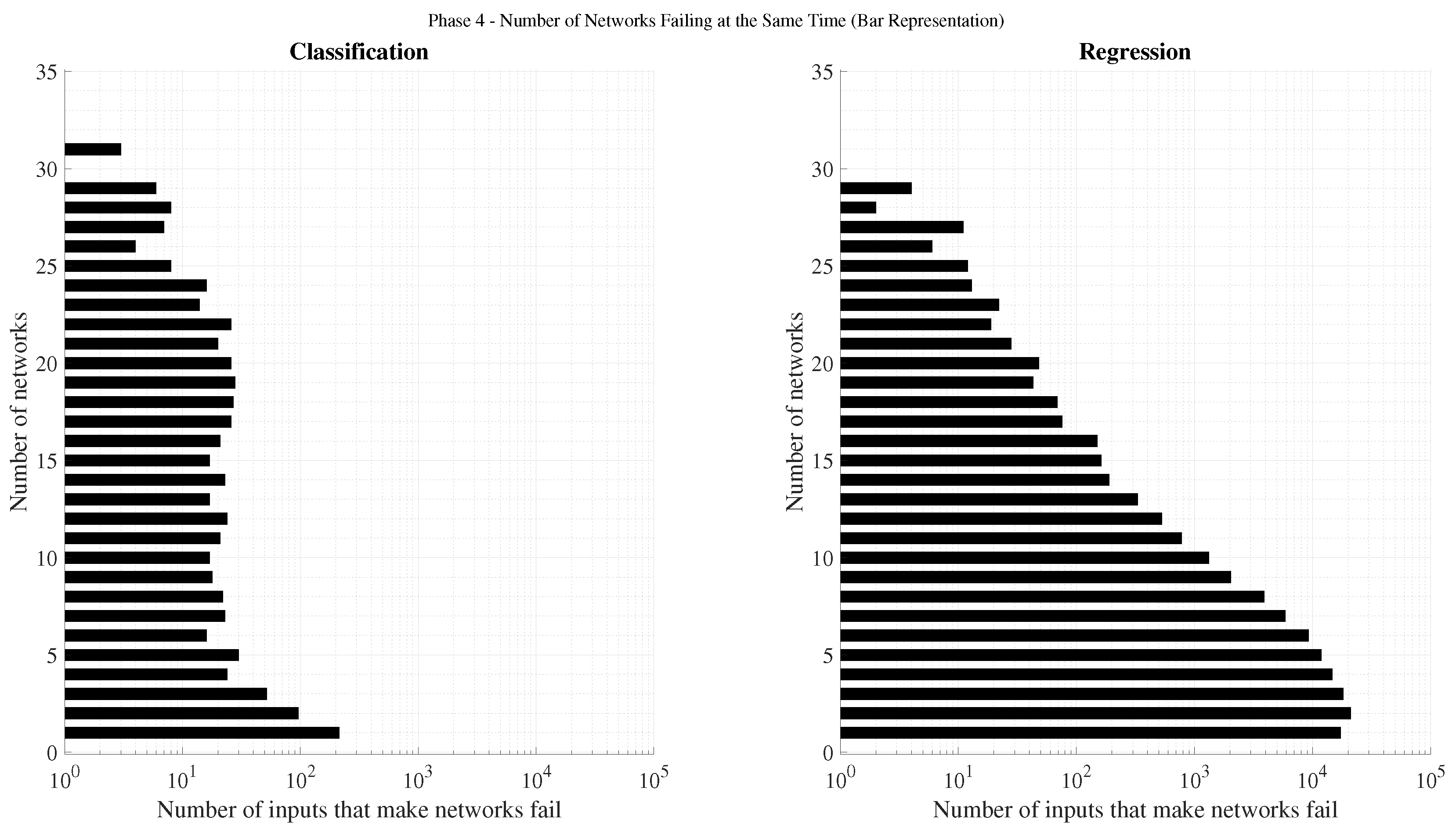 Each input sample is processed by all 35 networks within the model, resulting in 35 parallel outputs per time step. To assess whether failures in one network influence those in others, the number of simultaneous incorrect outputs across networks was analyzed. Figure 14 shows the distribution of instances in which K networks () failed simultaneously for the same input.