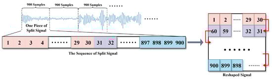 - Data Pre-Processing. The raw dataset is segmented into non-overlapping windows of 900 sampling points per data sample. To exploit spatial convolution operations and improve contextual understanding, the one-dimensional time-series signal is reshaped into a two-dimensional representation. Specifically, each 900-point sequence is rearranged into a serpentine pattern, forming a matrix in which temporal adjacency is preserved, as illustrated in Figure 1. This data preprocessing method has been proven to have a significant effect on TEM signals []. This mapping strategy maintains the temporal continuity of the original signal while enabling convolutional layers to capture both local and global contextual dependencies. Following the forward pass, the resulting feature map is flattened back into the one-dimensional format.