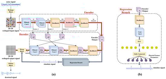 - Regression Branch Innovation. An auxiliary regression branch is introduced to explicitly model the underlying clean-signal characteristics. Unlike conventional methods that rely solely on reconstruction loss between noisy input and denoised output, the regression branch extracts intermediate encoder features and processes them to generate a simulated clean-signal representation. The branch consists of a residual block, a convolutional layer with ELU activation, and a fully connected network that outputs physical feature parameters (Figure 2b). This additional pathway provides strong physical priors, ensuring that the denoising process respects the inherent dynamics of the original signal.