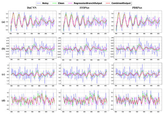 Based on the results summarized in Table 4, PDRNet consistently outperforms all competing models across different noise intensity levels (−3 dB, 0 dB, and 3 dB). The improvement is particularly pronounced when the regression branch (Reg-branch) is incorporated, which markedly enhances the Signal-to-Noise Ratio (SNR). Specifically, PDRNet achieves an SNR of 7.817 at −3 dB, 9.401 at 0 dB, and 12.51 at 3 dB, all of which clearly surpass the corresponding values of other models under identical conditions. Even without the regression branch, PDRNet still demonstrates competitive performance, although the SNR values are reduced compared with the Reg-branch configuration.