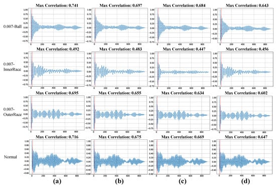 The autocorrelation function graph of the signal through different denoising model. Four rows represent Ball fault, Inner Race fault, Outer Race fault and Normal condition respectively. Column (a) represent clean signal, while column (b–d) represent noise signal processed by denoising model PDRNet, RND and DnCNN respectively. The red dotted line indicates the point where the signal reaches the peak of autocorrelation when the period is 18 or 19.