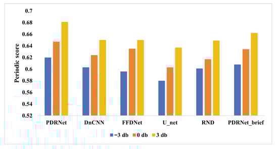 To further assess performance under varying noise intensities, we compute the periodicity score for signals processed by each model, as summarized in Figure 6. The results consistently highlight the significant advantage of PDRNet in preserving the core characteristics of motor vibration signals. For instance, at a noise level of 3 dB, our model achieves a periodicity score of 0.681, compared with 0.650 for DnCNN, 0.650 for FFDNet, 0.637 for U_Net, and 0.649 for RND. Importantly, the physical feature regression branch plays a pivotal role in maintaining periodic structure, as evidenced by the reduced score of 0.662 for PDRNet_brief, the variant without this branch. This result emphasizes the necessity of incorporating physical feature priors to effectively preserve the periodic structure and overall integrity of motor vibration signals, thereby demonstrating the substantial benefits of the proposed approach for real-world industrial applications.
