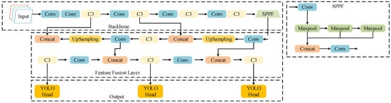 In the YOLOv5 framework, object detection is achieved through a combination of convolution, pooling, and feature fusion operations. After preprocessing, input images are resized to 640 × 640 × 3, and features are extracted by the backbone network. The feature fusion layer then combines multi-scale feature maps to identify objects of different sizes, with final predictions produced by the detection head.