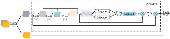 The FE-AFFM consists of n Adaptive Feature Fusion Modules (AFFMs) and two convolutional layers. At the initial stage, a 1 × 1 convolution is applied to compress the channel dimensions of the input features. This operation reduces computational cost while making the feature representation more compact and expressive. The compressed features are then divided into two streams: one is transmitted directly, while the other is fed into multiple AFFMs to perform multi-scale extraction and deep feature enhancement. Afterward, the two feature branches are concatenated along the channel axis, allowing complementary information to be integrated and reorganized. A final 1 × 1 convolution further refines the fused representation by aggregating channel information, producing the module’s output.