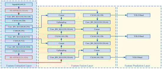 The improved network architecture is illustrated in Figure 6. Introducing the FE-AFFM at the head of the YOLOv5s backbone enhances the model’s data mining capabilities at source, providing richer information for subsequent feature extraction modules. Integrating the BE-AFFM at the tail of the backbone enables more flexible feature consolidation.