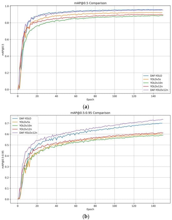 As shown in the figure, in the initial training phase of the model, the advantages of DAF-YOLO and DAF-YOLOv12n are not obvious. In the first ten rounds or so, YOLOv12n even maintains a lead over DAF-YOLO. After the fifteenth round of training, the convergence speed of the improved algorithm increases rapidly, gradually widening the gap with YOLOv5s, YOLOv10n and YOLOv12n. This gap is more obvious in Figure 9b.