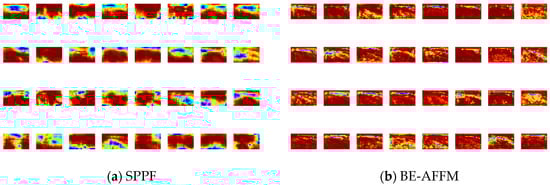 This paper compares the SPPF module in the baseline model with the improved BE-AFFM, visualizes the feature maps output by the two models, and analyzes their respective performance. As can be seen from Figure 12a, the feature map processed by SPPF has a smoother and more blurred region of interest, while the feature map processed by the BE-AFFM in Figure 12b has a clear sense of hierarchy, which greatly improves the nonlinear expressive ability of the model and enables more efficient feature fusion.