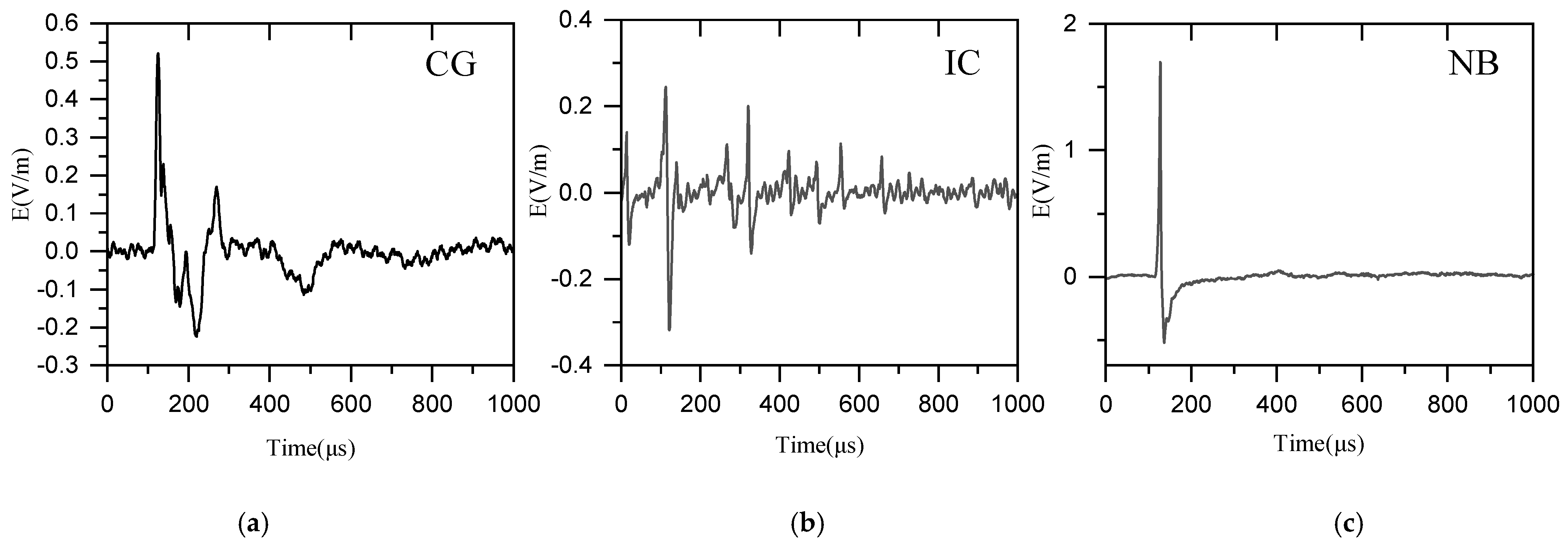 This study categorizes the identified LEMPs into three primary types: cloud-to-ground flashes (CG), ordinary intra-cloud flashes (IC), and Narrow Bipolar Events (NB). The typical waveforms are shown in