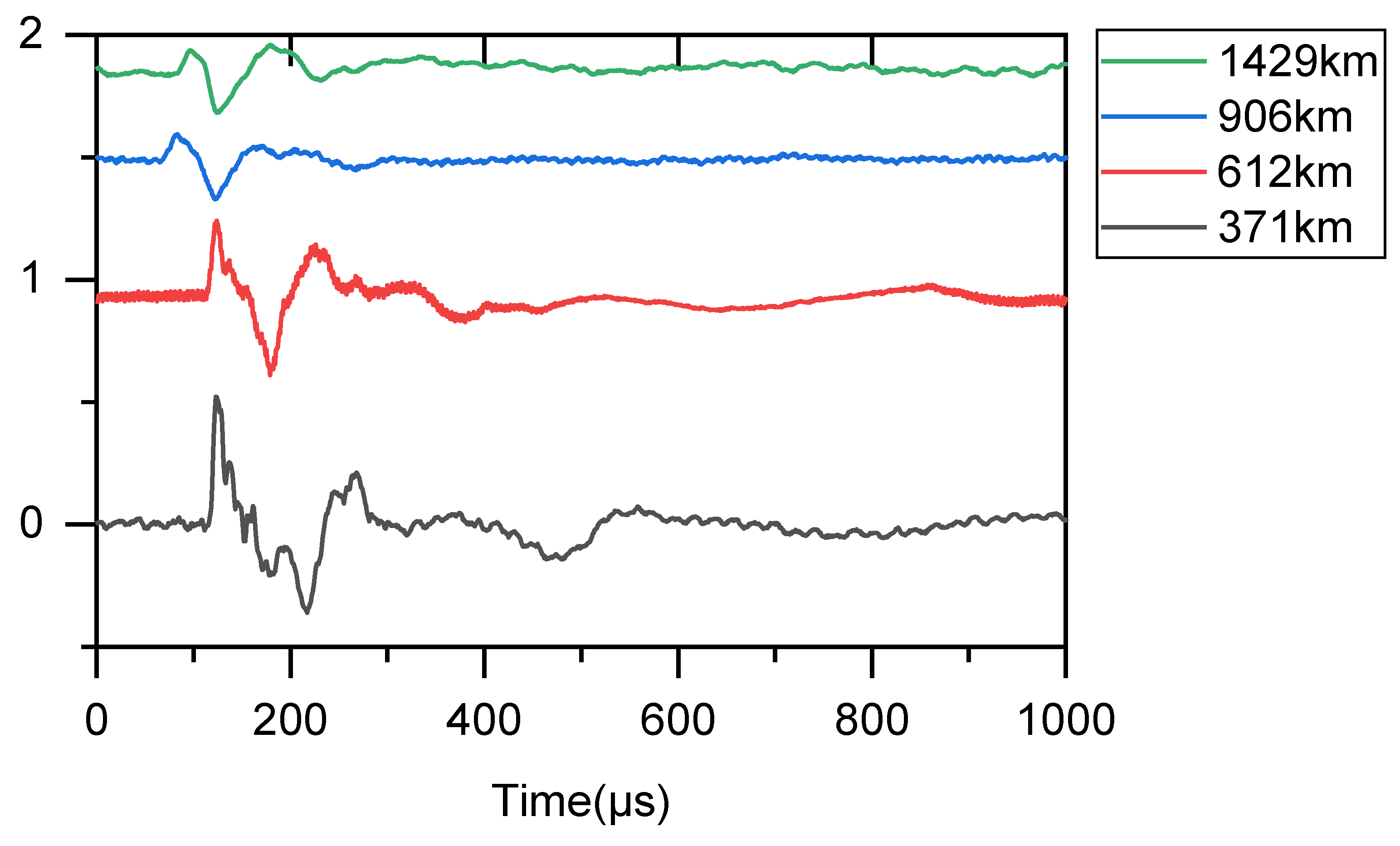 Figure 3 displays a cloud-to-ground flash waveform collected at 08:07:00.3333318 UTC on 15 October 2025. The black trace corresponds to the waveform received at the 371 km detection station, the red trace to the 612 km station, the blue trace to the 906 km station, and the green trace to the 1429 km station. All lightning detection stations recorded LEMPs with a duration of 1 ms. The vertical axis has no specific physical dimension.