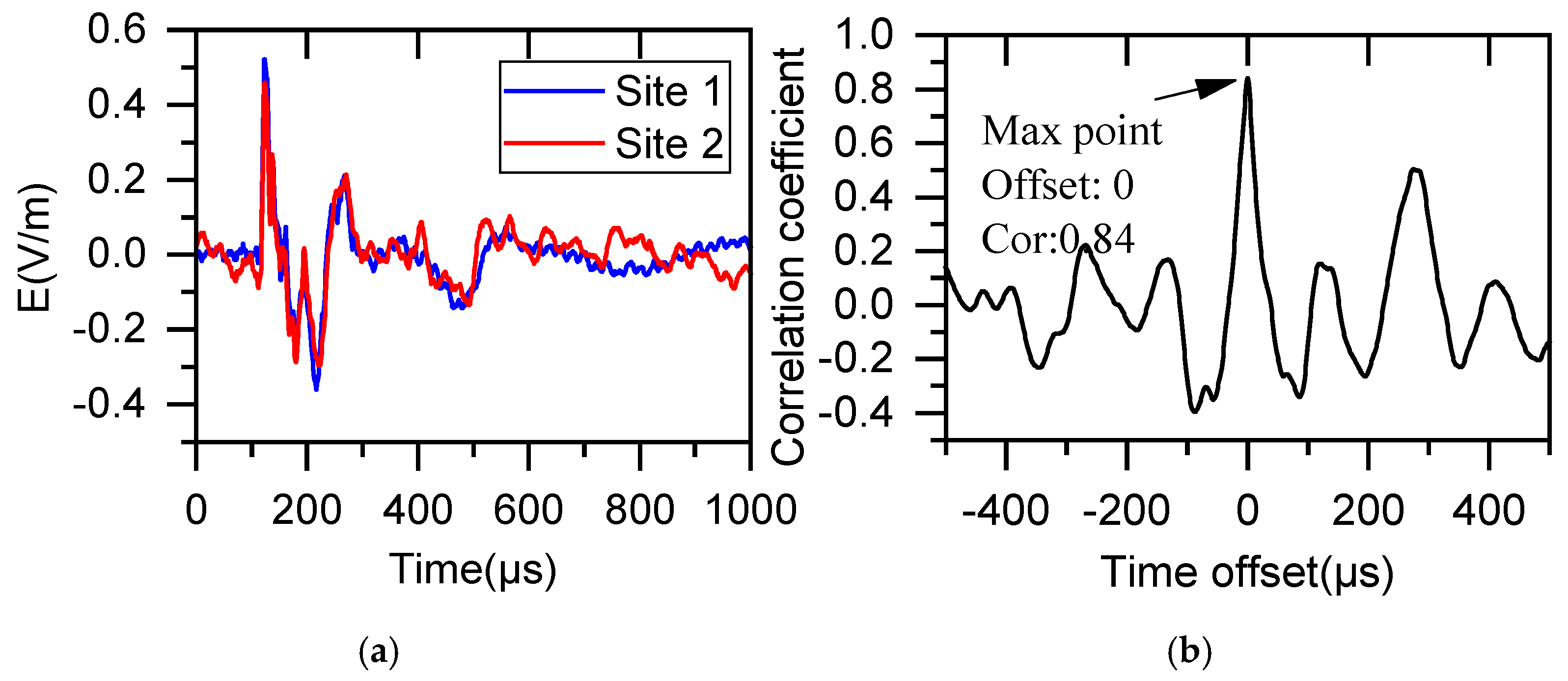 Figure 5 presents the cross-correlation computation results for a set of LEMPs using a sliding window approach. The obtained correlation coefficient of 0.84 indicates a positive correlation between the two waveforms.