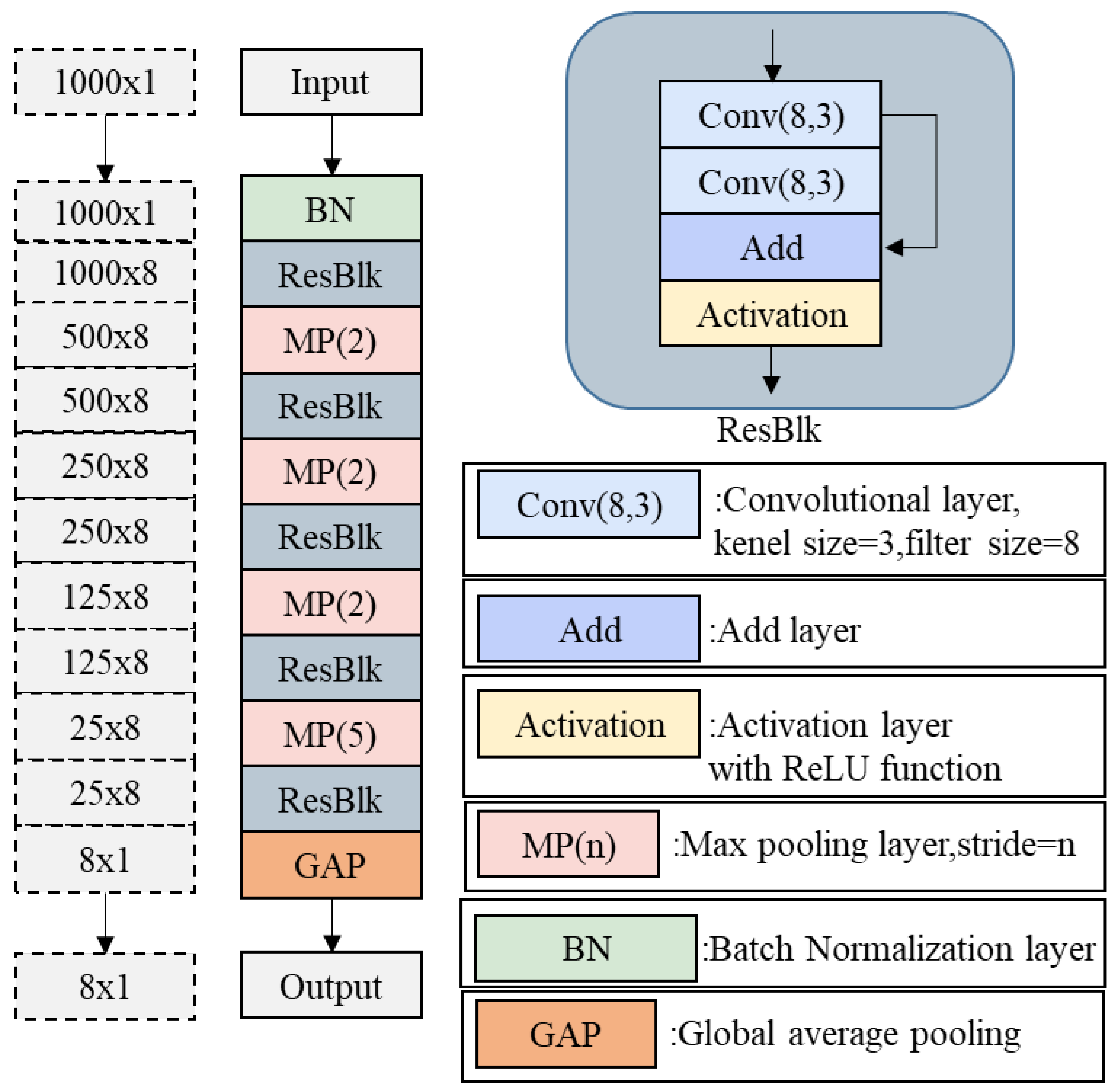 Figure 6. This branch is composed of an input layer, convolutional layers, batch normalization layers, activation layers, pooling layers, and residual blocks, stacked in a specific order. The parameters of the signal feature extraction network model are presented in