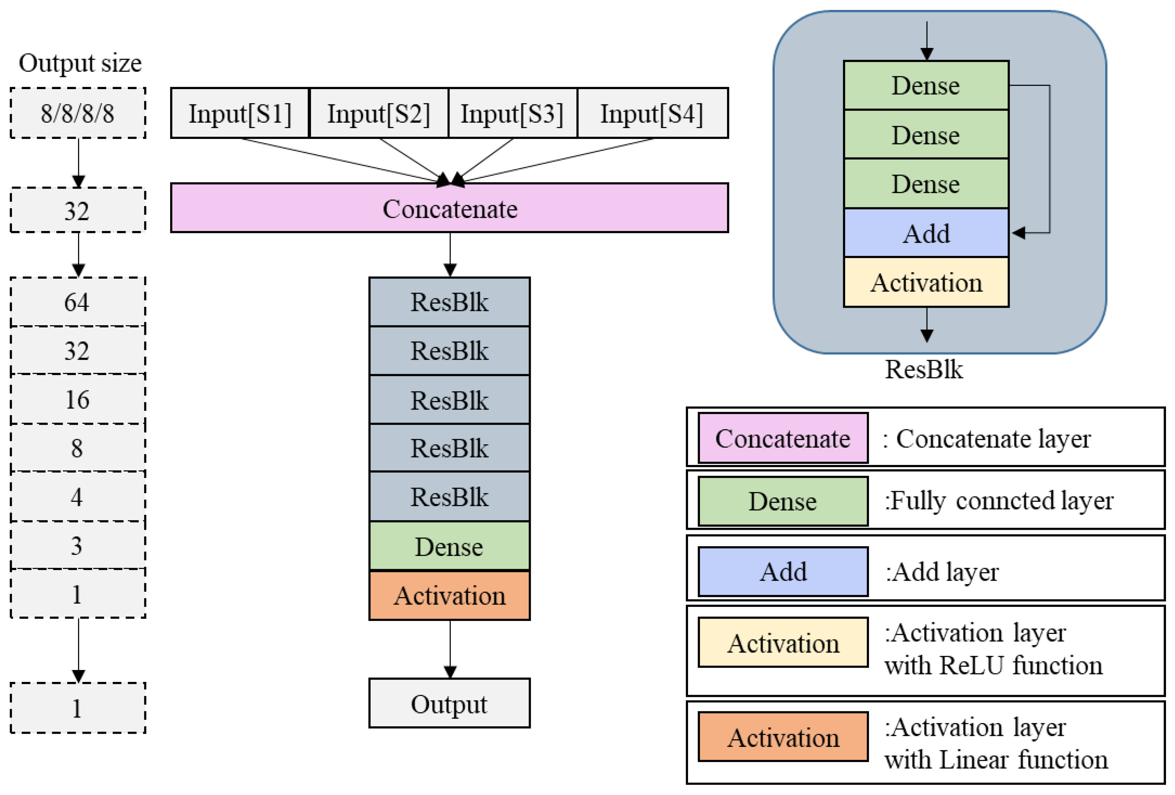 The 1 × 32 global feature vector output from the concatenation layer is subsequently fed into a feature recognition module composed of residual blocks and fully connected layers. The residual blocks maintain the same architectural design as described in