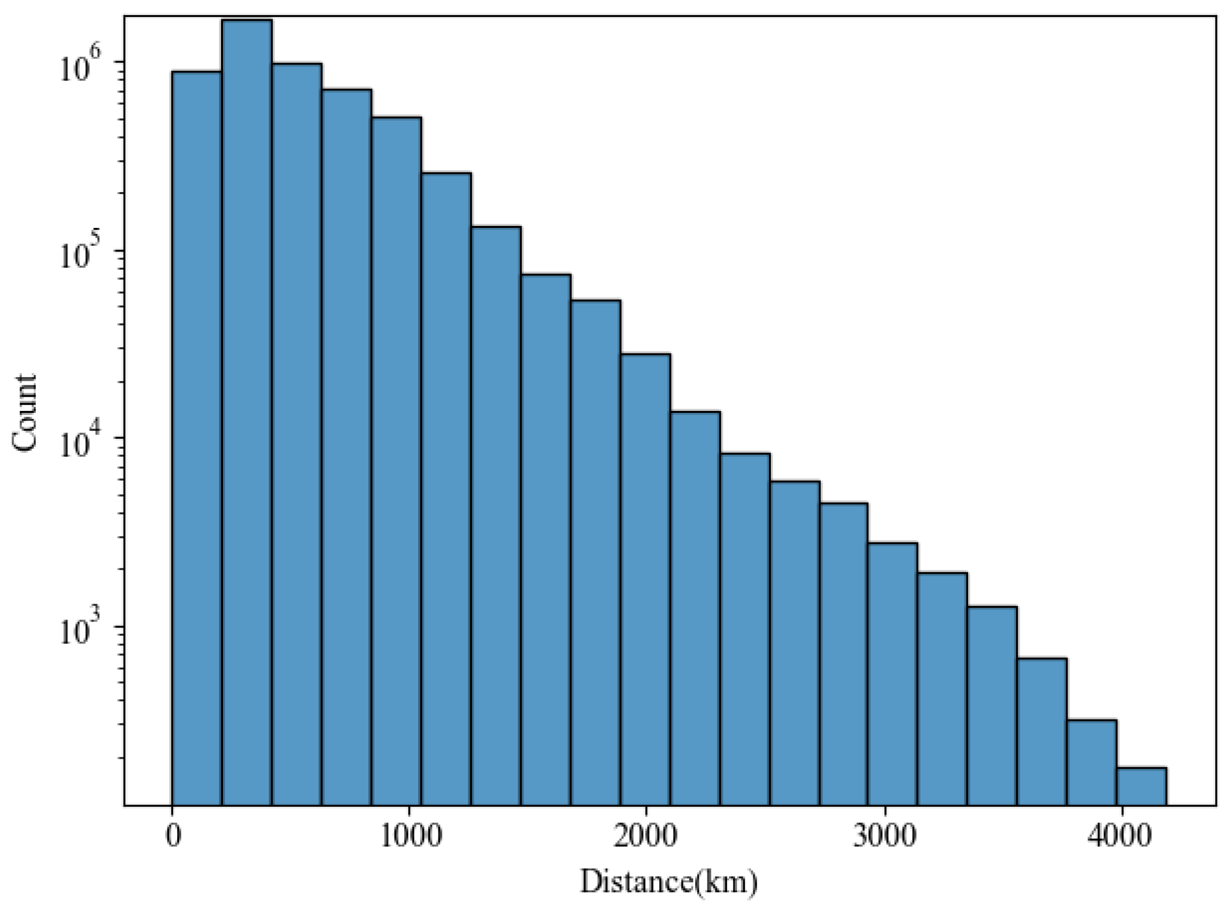 The sample data exhibits a pronounced decreasing trend with increasing distance. Within the proximal range (0–1000 km), the sample count reaches its maximum, on the order of 105 to 106. Beyond 1000 km, the number of samples declines rapidly, dropping below 102 at 4000 km. A substantial disparity in sample size exists across different distance intervals. The sample count in the proximal range (e.g., 0–500 km) exceeds that of long-range intervals (e.g., 3000–4000 km) by three to four orders of magnitude. This pronounced imbalance in distribution is primarily attributed to the convenience and abundance of empirical data collection in proximal regions.
