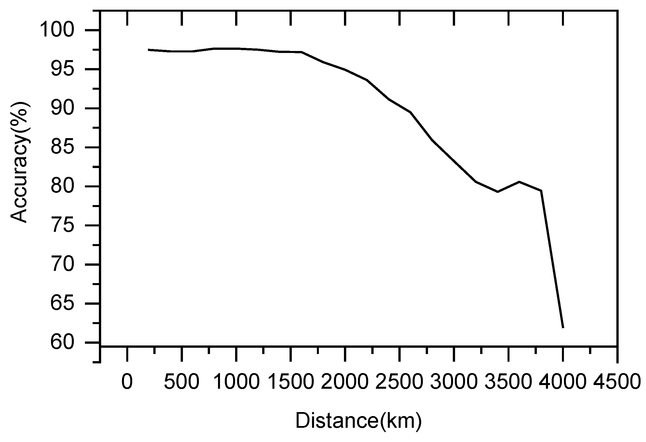 Beyond 3500 km, the model’s accuracy drops precipitously, declining sharply from around 80% to below 60%. This drastic deterioration is fundamentally attributed to the low accuracy of feature estimates under extreme-distance conditions: after long-range propagation, temporal characteristics of signals become severely distorted, and their intensity approaches noise-level thresholds, making it challenging for feature extraction branches to capture discriminative patterns. Furthermore, the location accuracy in multi-station collaborative localization increases significantly at such distances, further reducing the feature utilization efficiency of the fusion network, ultimately leading to a collapse in model performance.