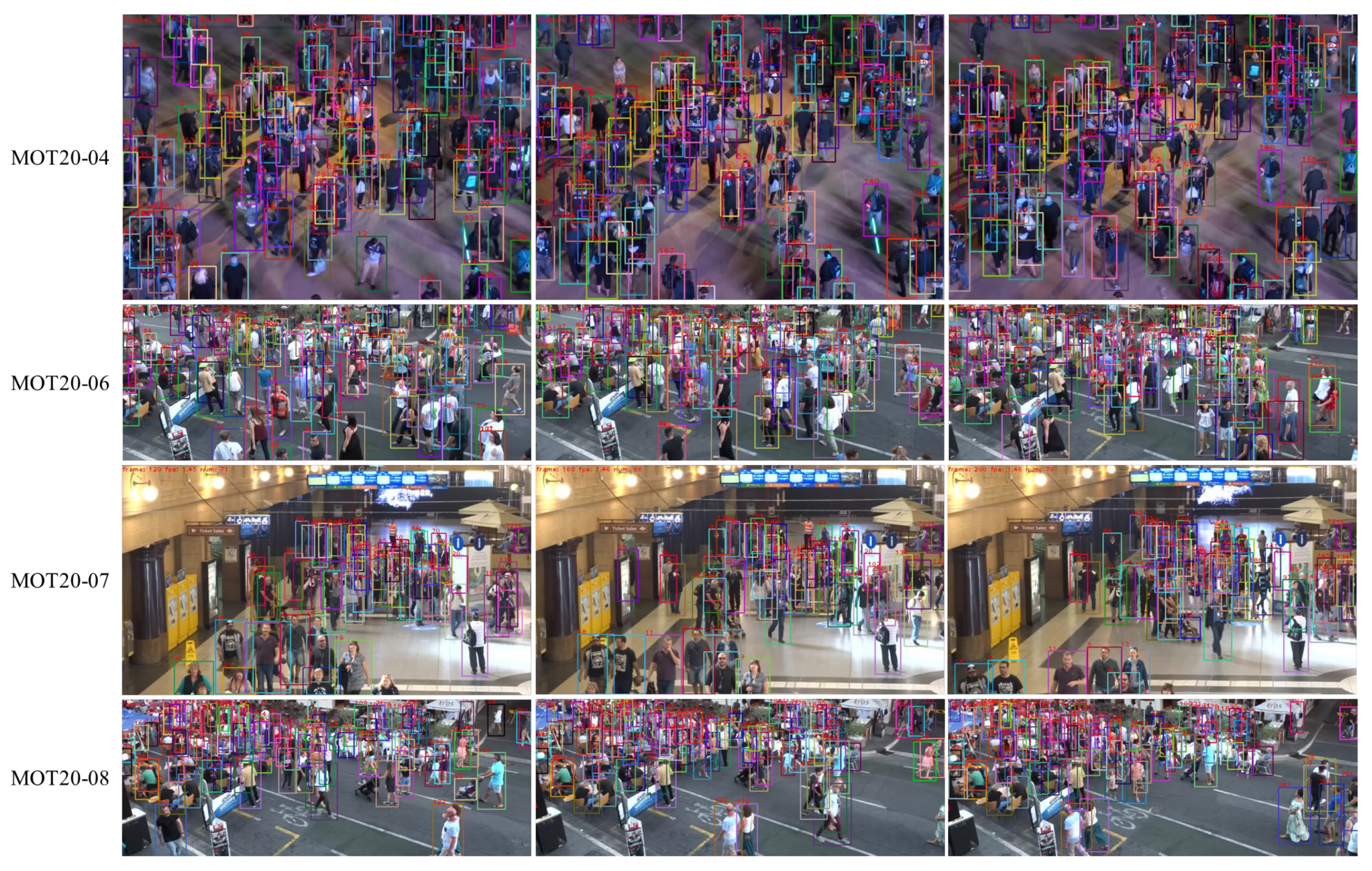 - Dendorfer, P.; Rezatofighi, H.; Milan, A.; Shi, J.; Cremers, D.; Reid, I.; Roth, S.; Schindler, K.; Leal-Taixé, L. Mot20: A benchmark for multi object tracking in crowded scenes. arXiv 2020, arXiv:2003.09003. [Google Scholar] [CrossRef]