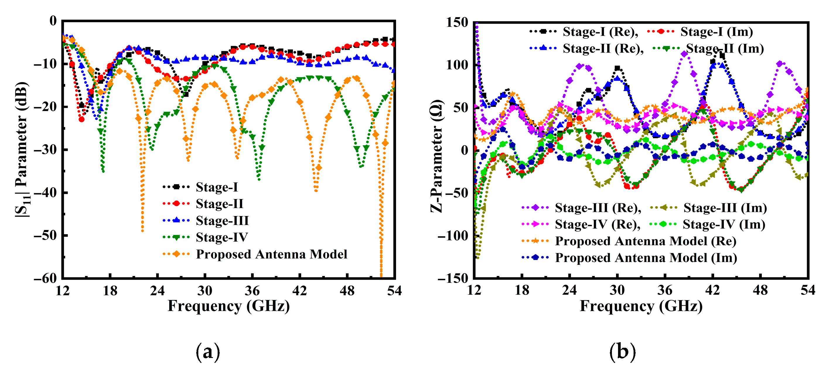 Moreover, the performance of the antenna is significantly influenced by the elliptic tuning stubs, tapered feedline, and partial ground plane. Consequently, the antenna achieves a broad impedance BW, enhanced high gain, and good matching over an extensive frequency range. The performance of the antenna prototypes, as indicated by the |S11| parameter, is illustrated in Figure 3a. Notably, the proposed antenna structure attains perfect matching with a fractional BW of 113.05% (red curve) from 15–54 GHz. In Figure 3b, the simulated variation of the real and imaginary parts of the z-parameter is presented, demonstrating that the input impedance of the antenna port is matched with a z value of 50 Ω at the operable resonances.