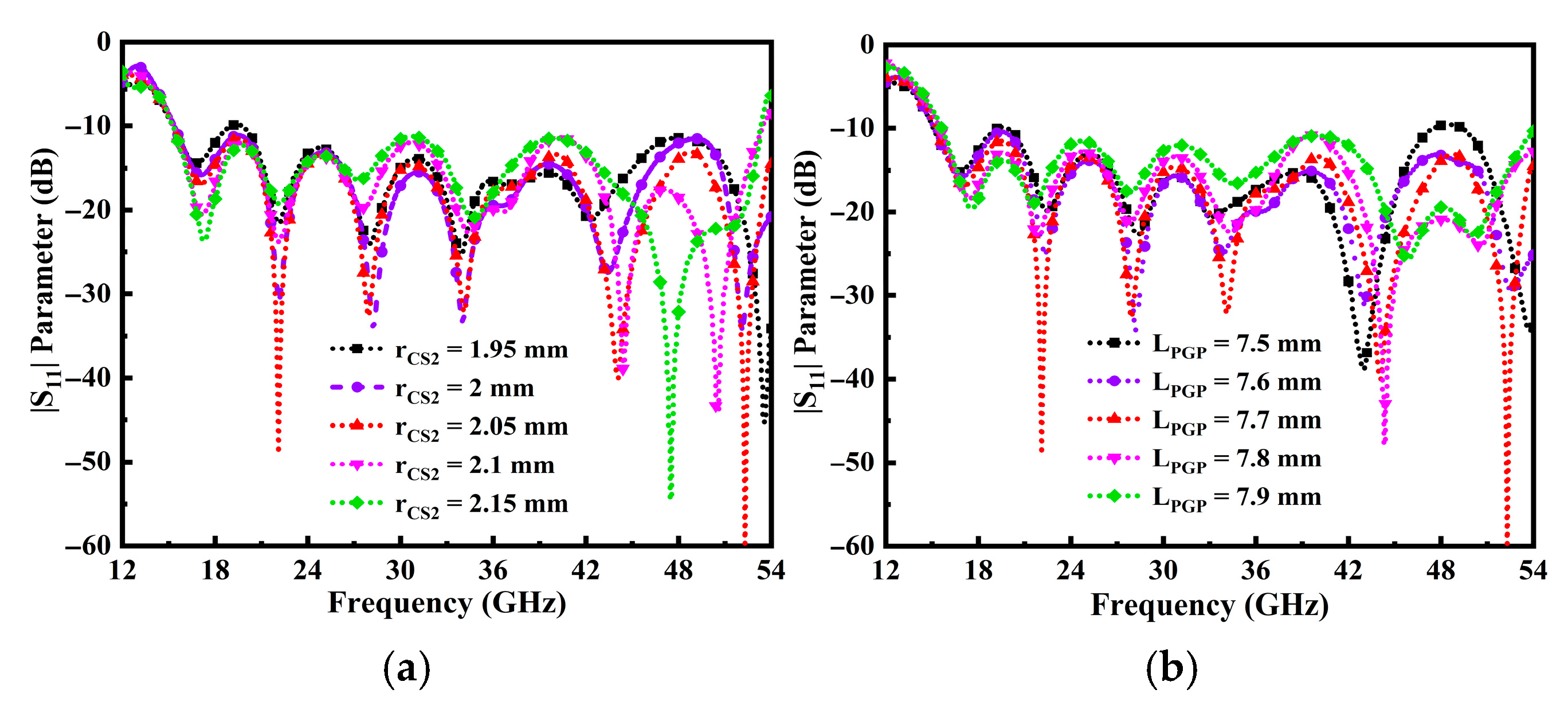 Notably, with a maximum value of LPGP set at 7.9 mm, the antenna achieves perfect impedance matching and a broad impedance BW, observed at the minimum value of 60 dB return loss. In addition, lower values of LPGP strongly affect the impedance BW. From the above analysis, it can be concluded that the rCS2 and LPGP have a great influence on the impedance matching and BW in the operable frequency span.