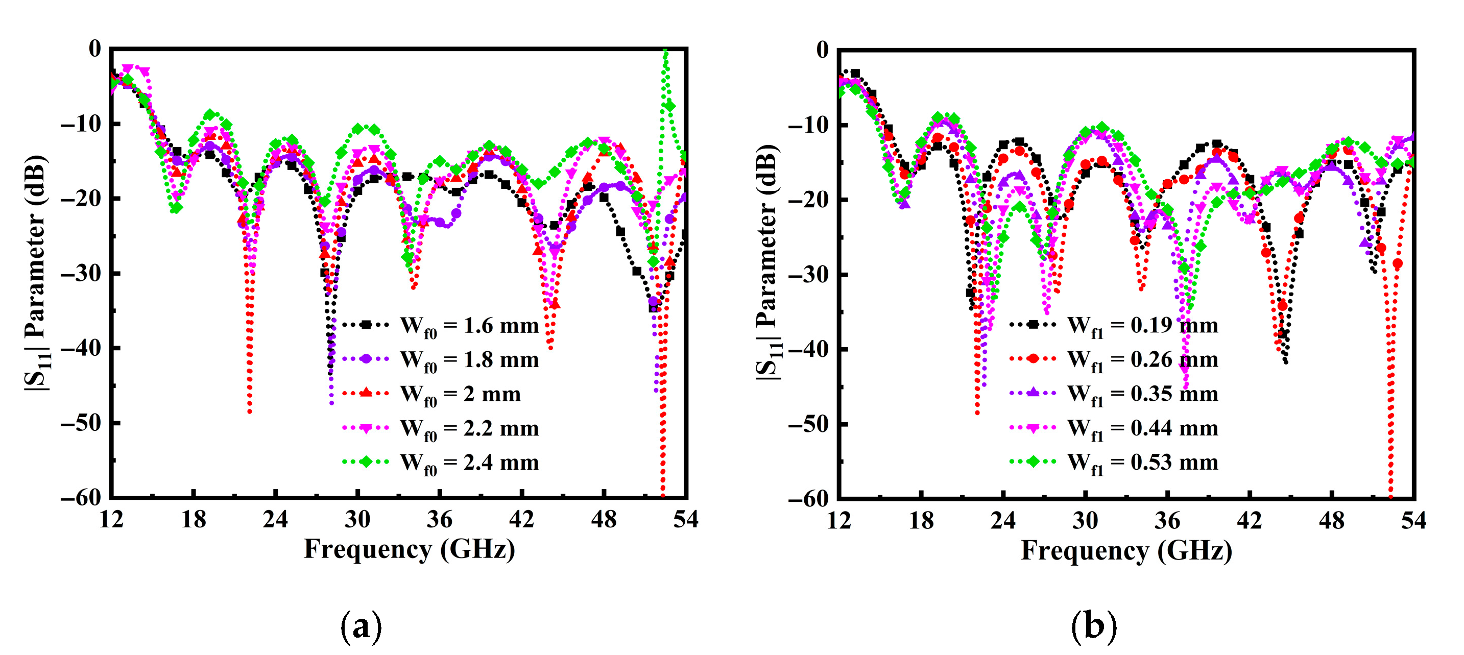 Moreover, the resonance frequency was found to be directly influenced by the longest current path. To improve the input impedance matching and achieve optimal wideband performance, the initial rectangular feedline was modified to a tapered feedline, as illustrated in Figure 2d. We evaluated this alteration by analyzing the reflection coefficient, S11 parameter, as shown in Figure 3a.