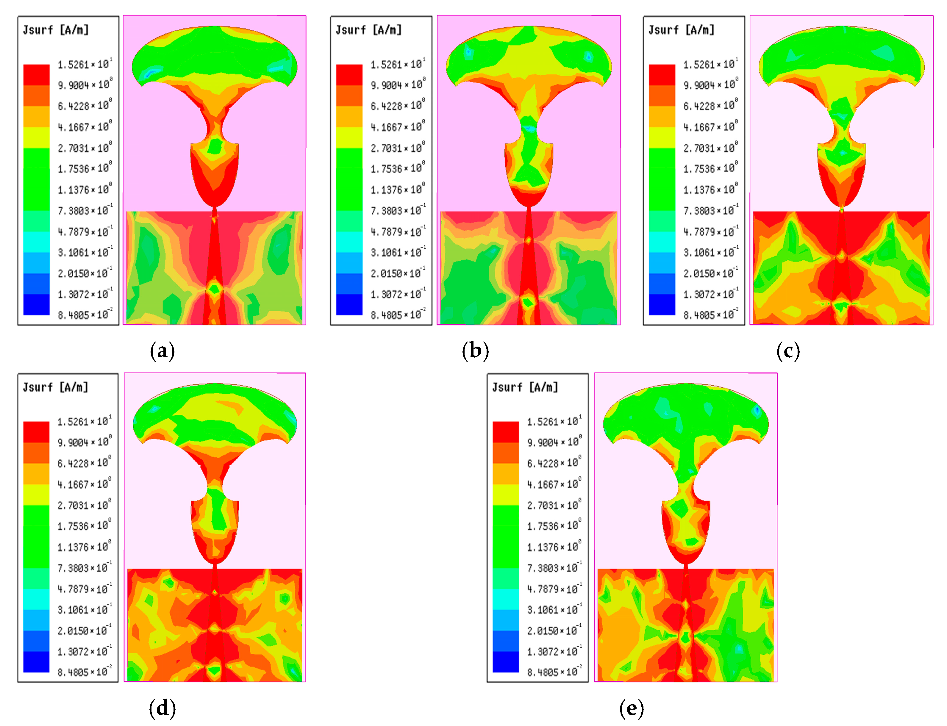 Figure 6. Current intensity of the antenna surface at resonant frequencies: (a) at 22.1 GHz, (b) at 27.9 GHz, (c) at 34.14 GHz, (d) at 44.2 GHz, and (e) at 51.8 GHz.