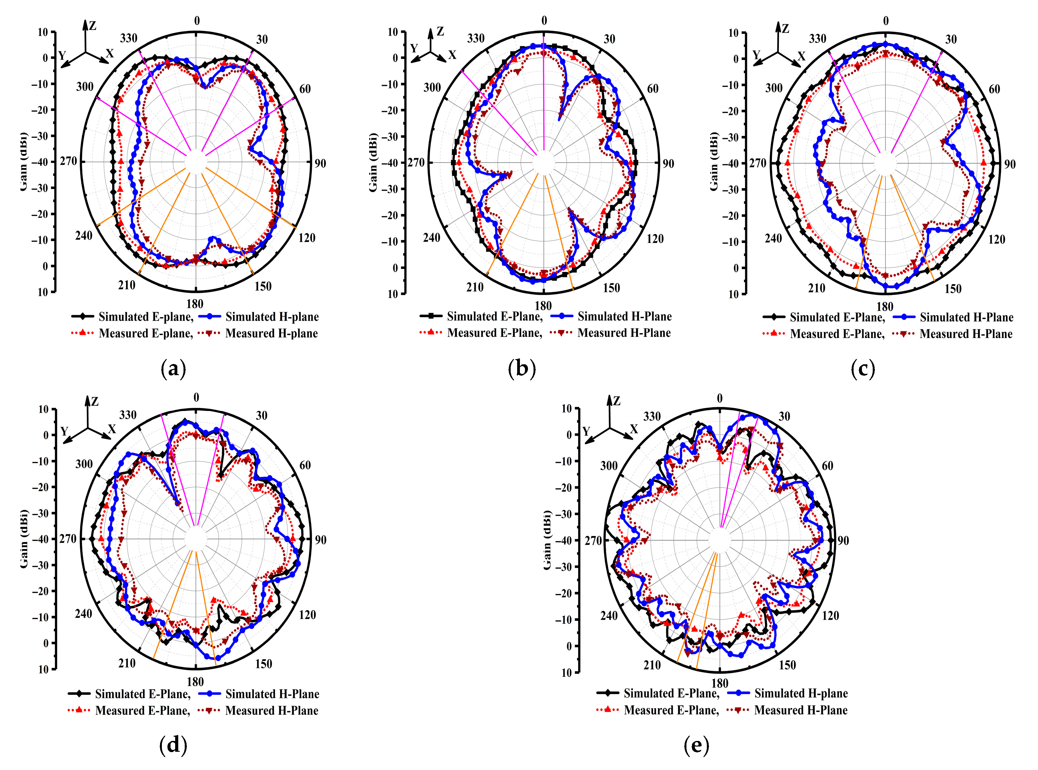 Figure 11. Radiation pattern performance Ф = 0° and Ф = 90° at different resonant frequencies: (a) at 22.1 GHz, (b) at 27.9 GHz, (c) 34.14 GHz, (d) 44.2 GHz, and (e) 51.8 GHz.