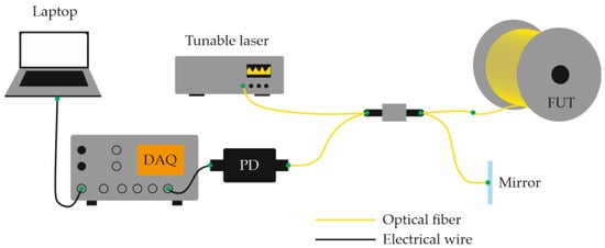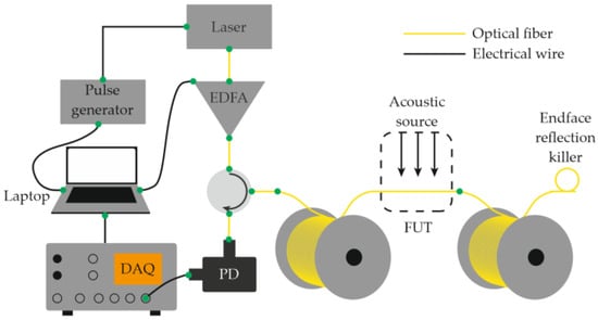 Basic Φ-OTDR setup schematic. Typical raw output data is presented in Figure 2. EDFA—erbium-doped fiber amplifier; PD—photodetector; FUT—fiber under test; DAQ—data acquisition card.