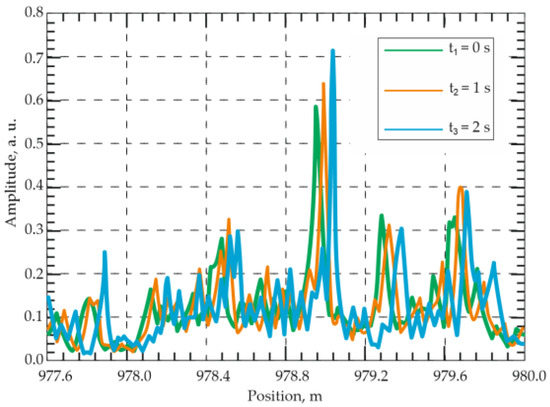 Using the same hardware configuration (Figure 5), García-Ruiz et al. [50] later implemented simultaneous temperature and dynamic strain measurements by feeding a ramp signal to the laser to induce a linear frequency chirp. The chirped pulses eliminated the need for signal averaging, thereby enhancing temperature-measurement precision. Temperature variations were detected as spatial shifts between consecutive traces acquired at times t and t + 1 (Figure 6); no shift occurred under constant T. Simultaneously, dynamic strain was evaluated by comparing subsequent successive traces. The method is compatible with classical Φ-OTDR systems without major modification. In a 1 km experiment, 10 m spatial resolution was achieved. However, the authors claimed it was scalability with a spatial resolution of several meters and fiber length of several tens of kilometers. The reported resolutions were 1 mK for temperature and 4 nε for strain. The dynamic strain amplitude ranged from −300 to 300 nε at 1–850 Hz, and temperature tests involved heating a 20 m fiber section from 23 to 27.5 °C and cooling it over 270 min.
