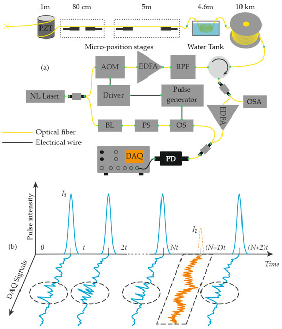 (a) Unit combining Φ-OTDR and BOTDR techniques for the simultaneous recording of temperature, vibration, and deformation effects. NL—narrow-linewidth laser; OSA—optical spectrum analyzer; OS—optical switch; PS—polarization scrambler; BL—Brillouin laser. (b) Probe pulses used in the device and a representative sample of the recorded output data.