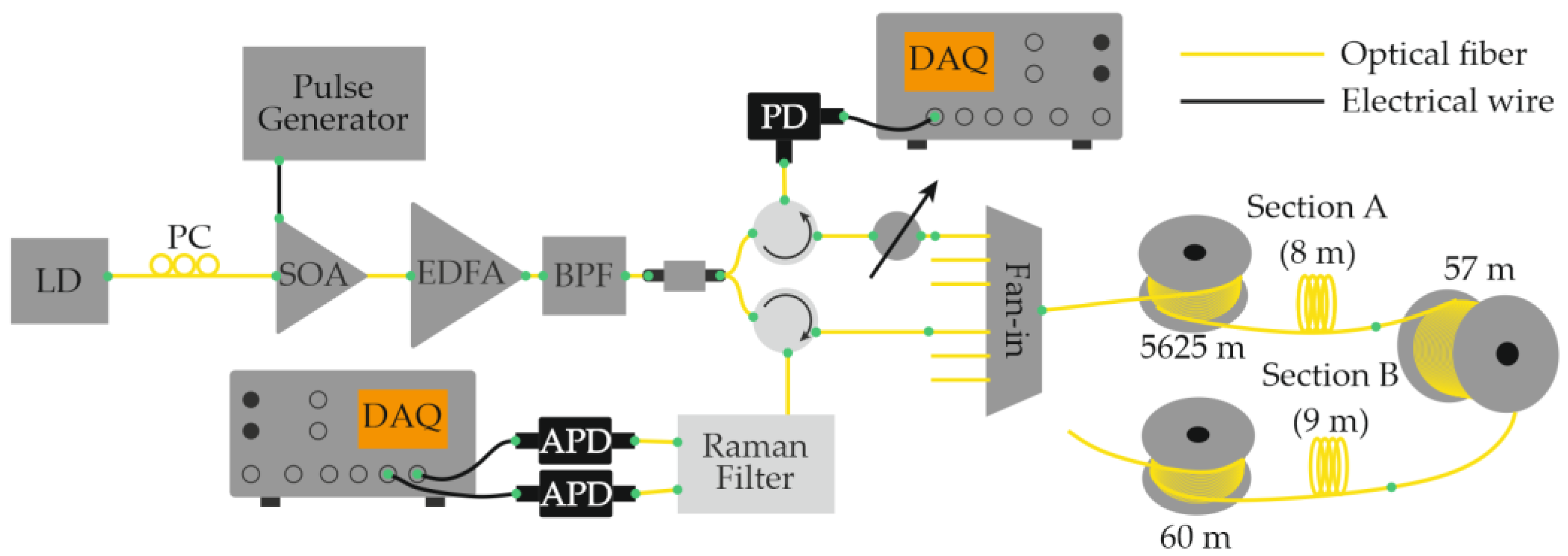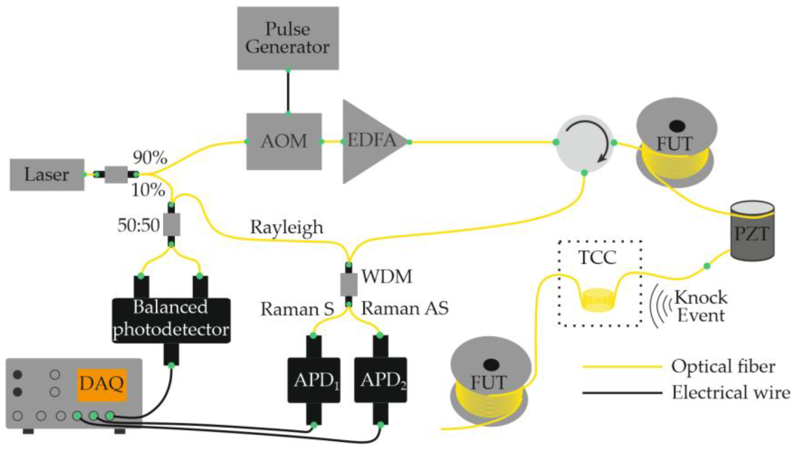 - Spectral or frequency (wavelength) separation—implemented through wavelength-division multiplexing or by exploiting different scattering mechanisms (Rayleigh, Brillouin, Raman).