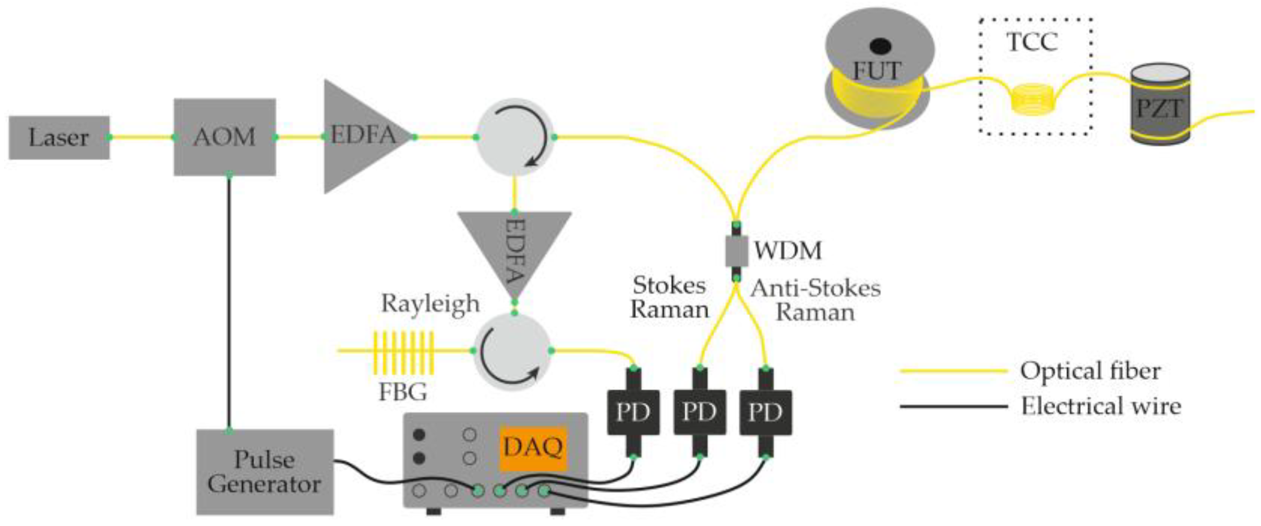- Sheng, L.; Li, L.; Hu, L.; Yuan, M.; Lang, J.; Wang, J.; Li, P.; Bi, Z.; Yan, J.; Liu, Z. Distributed Fiberoptic Sensor for Simultaneous Temperature and Strain Monitoring Based on Brillouin Scattering Effect in Polyimide-Coated Fibers. Int. J. Opt. 2020, 1, 8810986. [Google Scholar] [CrossRef]
