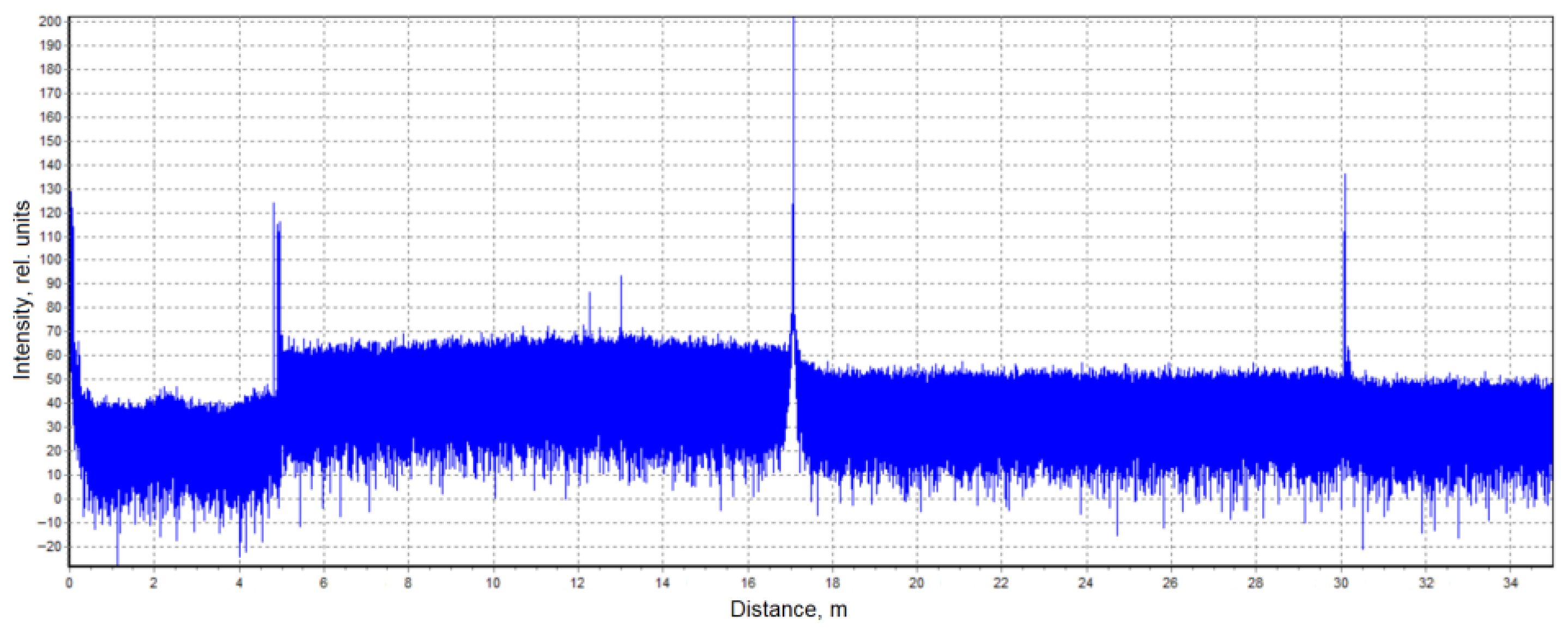 - Belokrylov, M.E.; Claude, D.; Konstantinov, Y.A.; Karnaushkin, P.V.; Ovchinnikov, K.A.; Krishtop, V.V.; Gilev, D.G.; Barkov, F.L.; Ponomarev, R.S. Method for Increasing the Signal-to-Noise Ratio of Rayleigh Back-Scattered Radiation Registered by a Frequency Domain Optical Reflectometer Using Two-Stage Erbium Amplification. Instrum. Exp. Tech. 2023, 66, 761–768. [Google Scholar] [CrossRef]