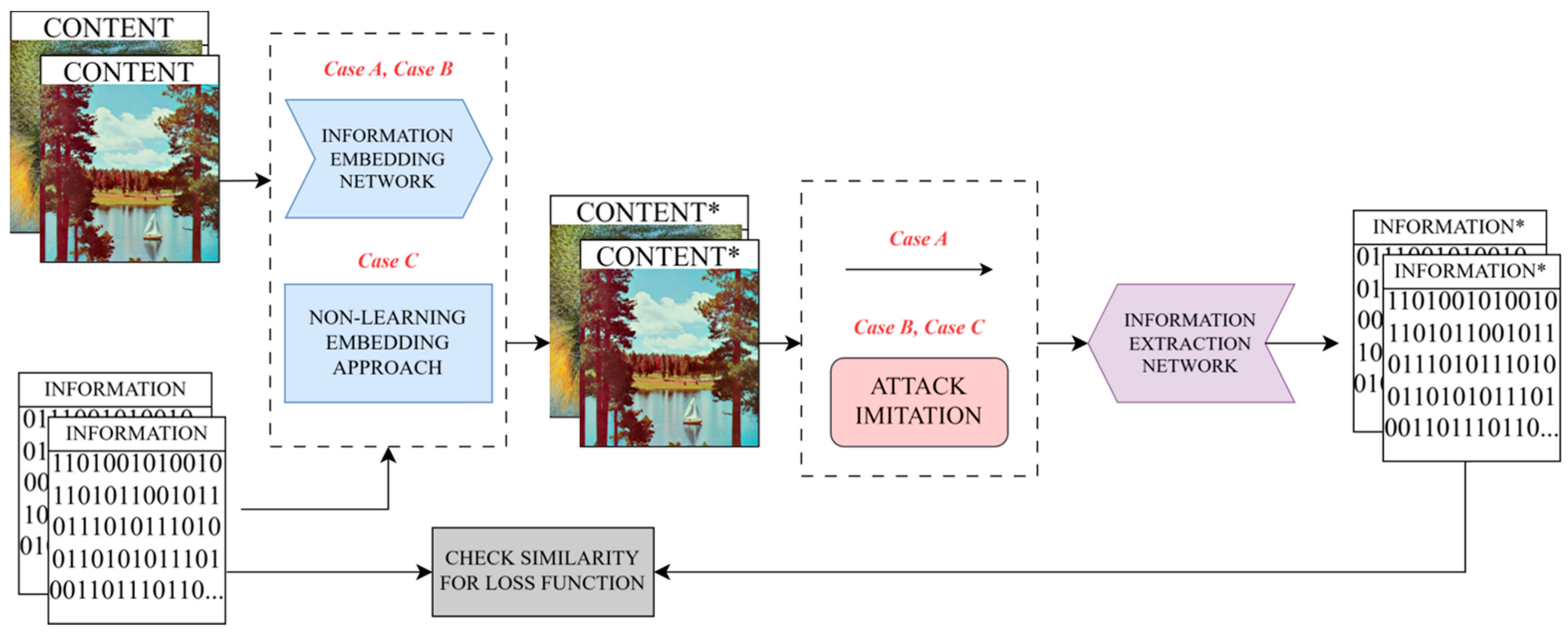 A typical use case for end-to-end embedding with neural networks involves two networks: an embedding network and an extracting network. These networks are often trained jointly, and the training process involves synchronizing them with each other. In reality, although an embedding and extracting network is sufficient to build a working scheme with high embedding imperceptibility, achieving robustness requires additional measures.