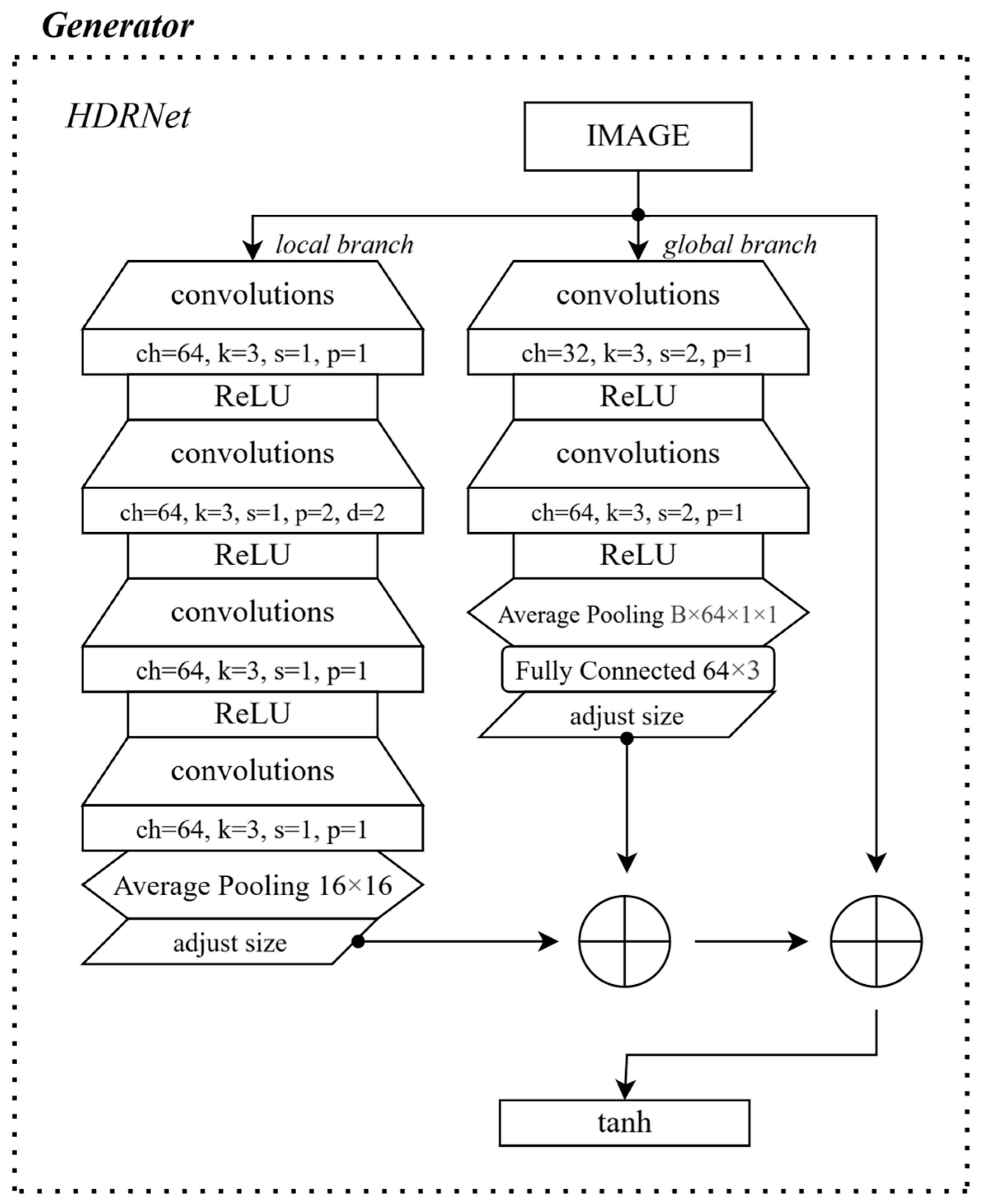 25]. The main idea is that the input image is first processed through a local branch, after which the resulting activation map is bilinearly interpolated back to the original image dimensions. In parallel, the image passes through a global branch and a fully connected layer to form an activation map that captures more global patterns. The resulting activation maps, which match the original image size, are then combined pixel by pixel with the input image to create color transformations. The generator structure is illustrated in
