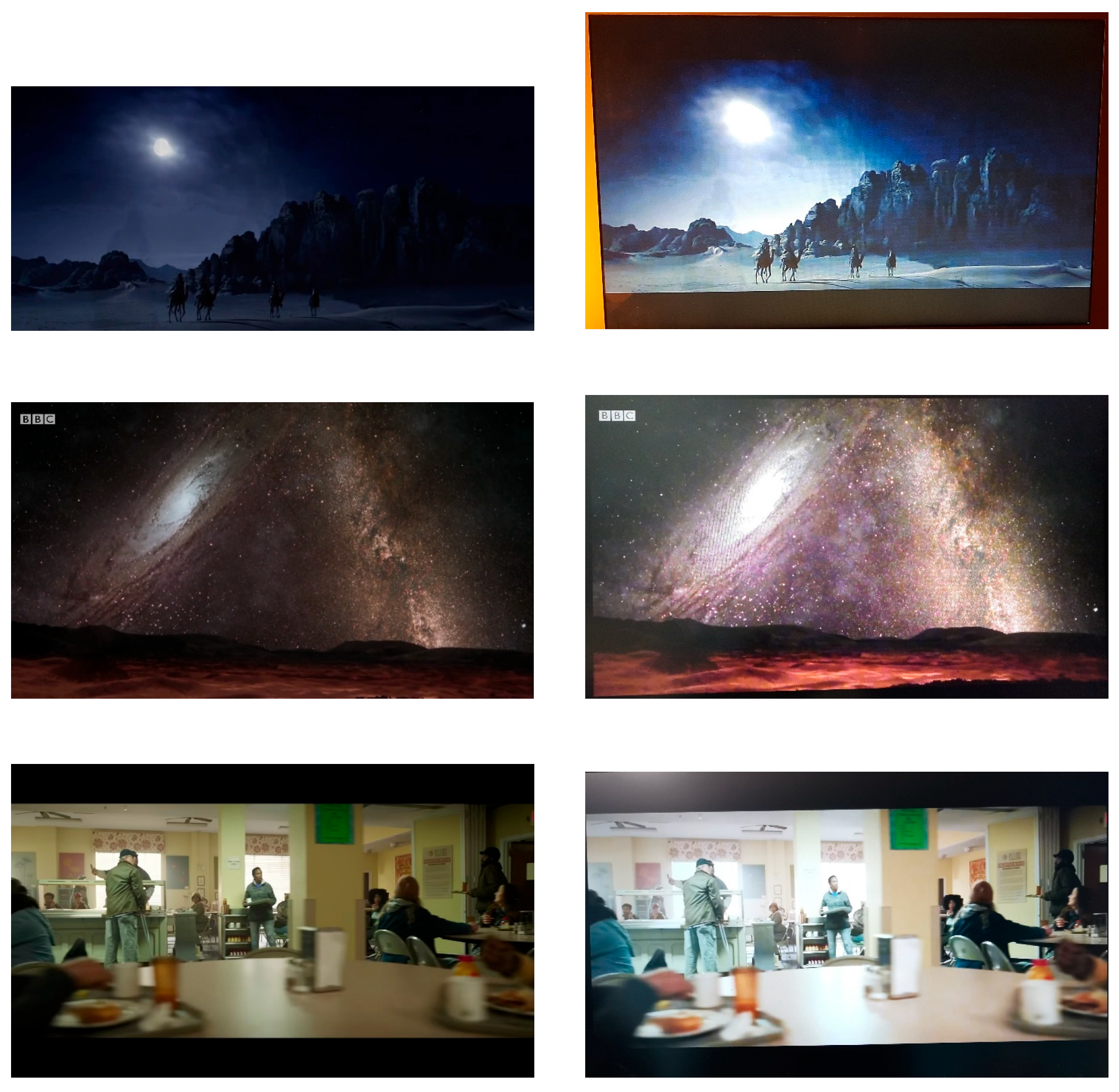 Examples of the module’s output, the original (undistorted) images, and the images obtained from an actual screen-cam attack are shown in