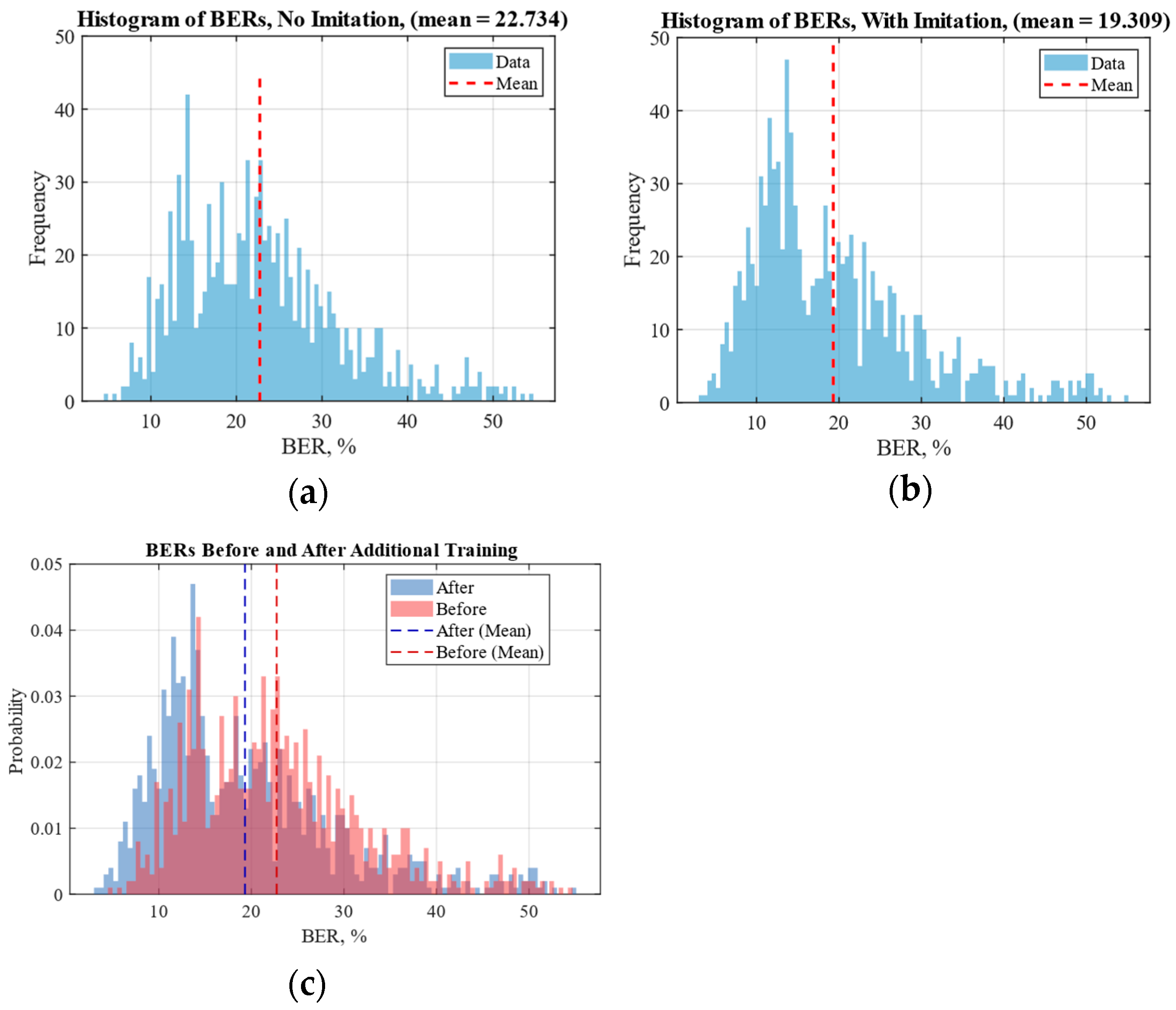 From the combined histograms, it can be observed that, after training, the peak of the histogram becomes more pronounced and shifts to lower BER values.