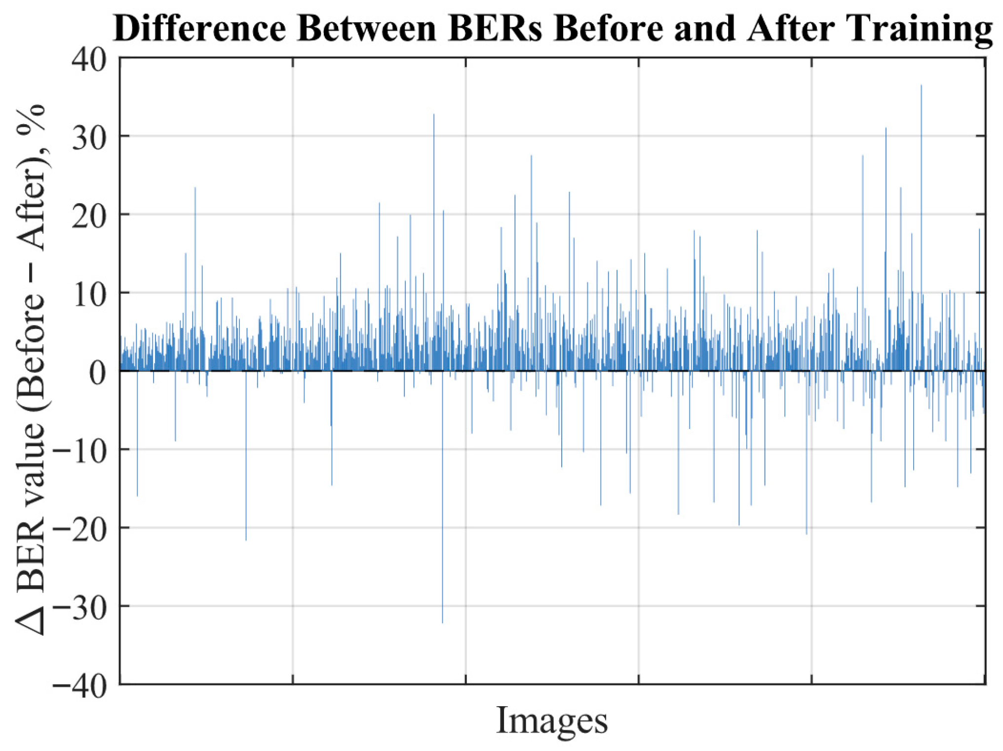 Table 3 presents the statistical characteristics of the BER values obtained before and after additional training for 1000 images.