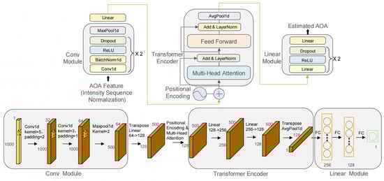 This paper adopts a hybrid neural network architecture for angle regression, designed to accurately predict the AOA of incident free-space light from fringe data. This network combines the feature extraction capabilities of a convolutional neural network with the sequence modeling advantages of a multi-head self-attention mechanism. The overall architecture of the model and the process of data dimensionality change within the network are detailed in Figure 4. The model is primarily composed of the following three core modules: a CNN feature extractor, a Transformer-based encoder (including multi-head attention and a feed-forward network), and an MLP regression head. Through the synergistic action of these modules, the model can effectively extract light intensity sequence features from the input data and learn the complex relationships between these features, ultimately achieving precise angle prediction.