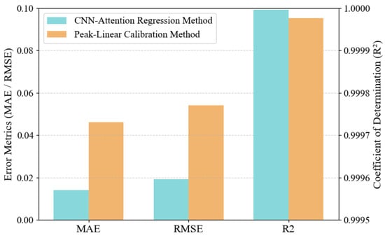 The systematic “W-shaped” error from the peak–linear method (Figure 8b) is physically explained by the device’s governing grating equation, (Equation (19)). This inherent nonlinearity means that forcing a linear fit between the input AOA and the output peak position introduces a predictable, systematic error, whose theoretical shape is shown in Figure 8b. While the linear approximation is adequate near the center of the field-of-view, the pronounced nonlinearity at the angular extremes causes large deviations, resulting in the observed “W-shaped” error pattern. The proposed CNN–Attention regressor, however, is not bound by this linear constraint. It directly learns the complex nonlinear mapping from the intensity sequence, thus avoiding such systematic biases and achieving uniformly high accuracy across the entire detection range.