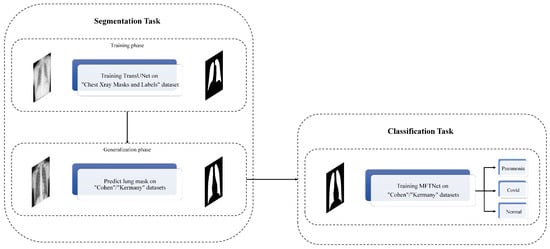 As shown in Figure 3, after successfully training the TransUNet model on the “Chest Xray Masks and Labels” dataset, we utilize this pre-trained segmentation model to predict lung masks for the “Cohen”/“Kermany” datasets. This step is crucial for enhancing the accuracy of the classification task by focusing on the lung regions within the X-ray images.