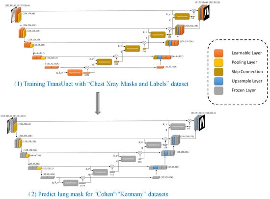 To address these challenges, we propose an innovative approach that leverages deep learning through an integrated lightweight transformer. The proposed transformer significantly reducing the number of parameters compared to traditional transformers while maintaining lower model complexity. Our method begins with lung segmentation using a TransUNet model, which integrates transformer-based attention mechanisms into the U-Net architecture. The TransUNet model is trained on the “Chest X-ray Masks and Labels” dataset [13,14] to accurately segment lung regions in the images. Once trained, this pre-trained model is used with frozen weights to predict lung masks for our target datasets, “Kermany” [15] and “Cohen” [16]. This segmentation step isolates the lung regions, thereby enhancing the subsequent classification task.