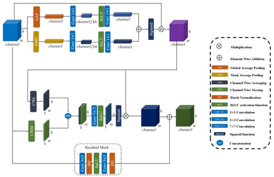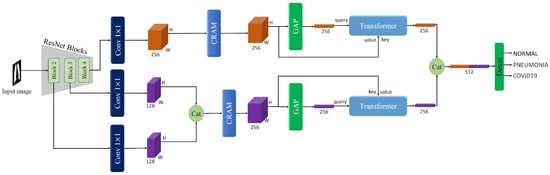 To further refine the multi-scale feature representations extracted from the ResNet backbone, we propose a CRAM module. As shown in Figure 6, this module operates on two parallel pathways to enhance feature discriminability while preserving spatial relationships. The CRAM is applied to both feature streams: the high-level semantic features from Block 4 () and the merged multi-scale features from Blocks 2 and 3 ().