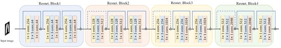 The backbone of our proposed method utilizes a pre-trained ResNet model, specifically ResNet-50 or ResNet-101, to extract multi-scale feature maps from the input chest X-ray images. An illustration of the ResNet architecture is provided in Figure 5. Initially, we resize all images to 512 × 512 pixels. We focus on the outputs from Block 2, Block 3, and Block 4 of the ResNet, denoted as , , and , respectively. Each of these blocks provides feature maps of size , where . The numbers of channels (c) for these blocks are 512, 1024, and 2048, respectively.