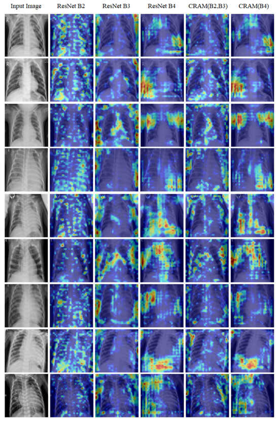 As shown in Figure 9, our Grad-CAM analysis reveals the hierarchical feature learning process across different network depths. The first column displays the original input chest X-ray image, providing the baseline for comparison. The subsequent three columns visualize the activation maps from the feature maps extracted at different ResNet blocks: Block 2 (capturing low-level features and basic patterns), Block 3 (capturing mid-level features and structural information), and Block 4 (capturing high-level semantic features and complex patterns). The final two columns present the activation maps from our CRAM: the concatenated feature map (merging Blocks 2 and 3) and the enhanced Block 4 feature map.