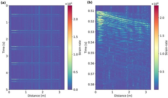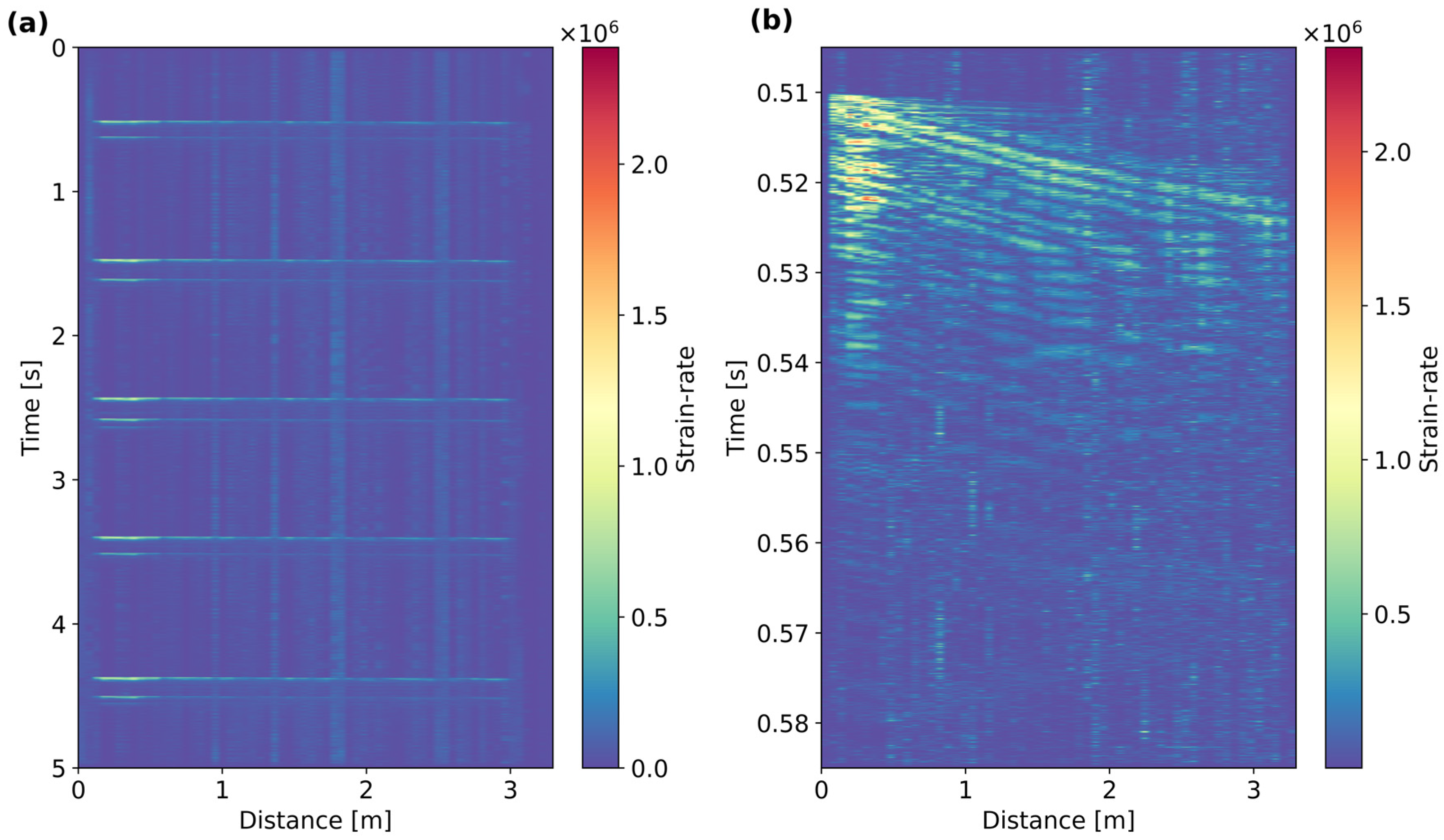 The data recording was performed utilizing an iDAS v2 interrogator, of 10 m gauge length, manufactured by Silixa Ltd. in London, The United Kingdom. To enable the highest possible temporal resolution, the sampling frequency was set to 100 kHz with a duration of 5 s. The spatial resolution for the data acquisition was set to 1.0 m. In post-processing, the number of channels was downsampled to set the optimum channel spacing to 5.78 cm, as described in