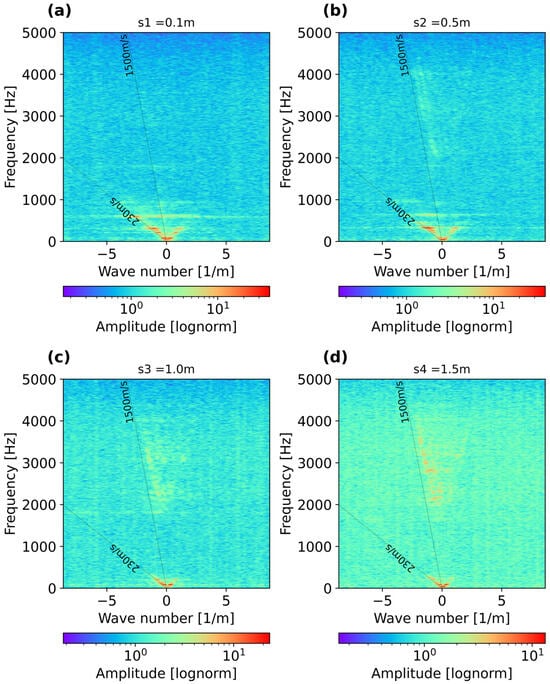 Frequency–wavenumber spectra (f–k) recorded at different shot positions: (a) s1 = 0.1 m, (b) s2 = 0.5 m, (c) s3 = 1.0 m, and (d) s4 = 1.5 m.