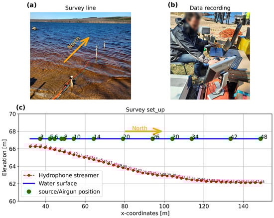 (a) Deployed fiber-optic cable (blue cable) alongside the hydrophone streamer (orange cable), (b) data acquisition, and (c) scheme of the source positions. The blue line represents the water level, the green dots approximate the source positions, and the red dots depict the location of the 48 hydrophones.