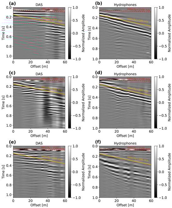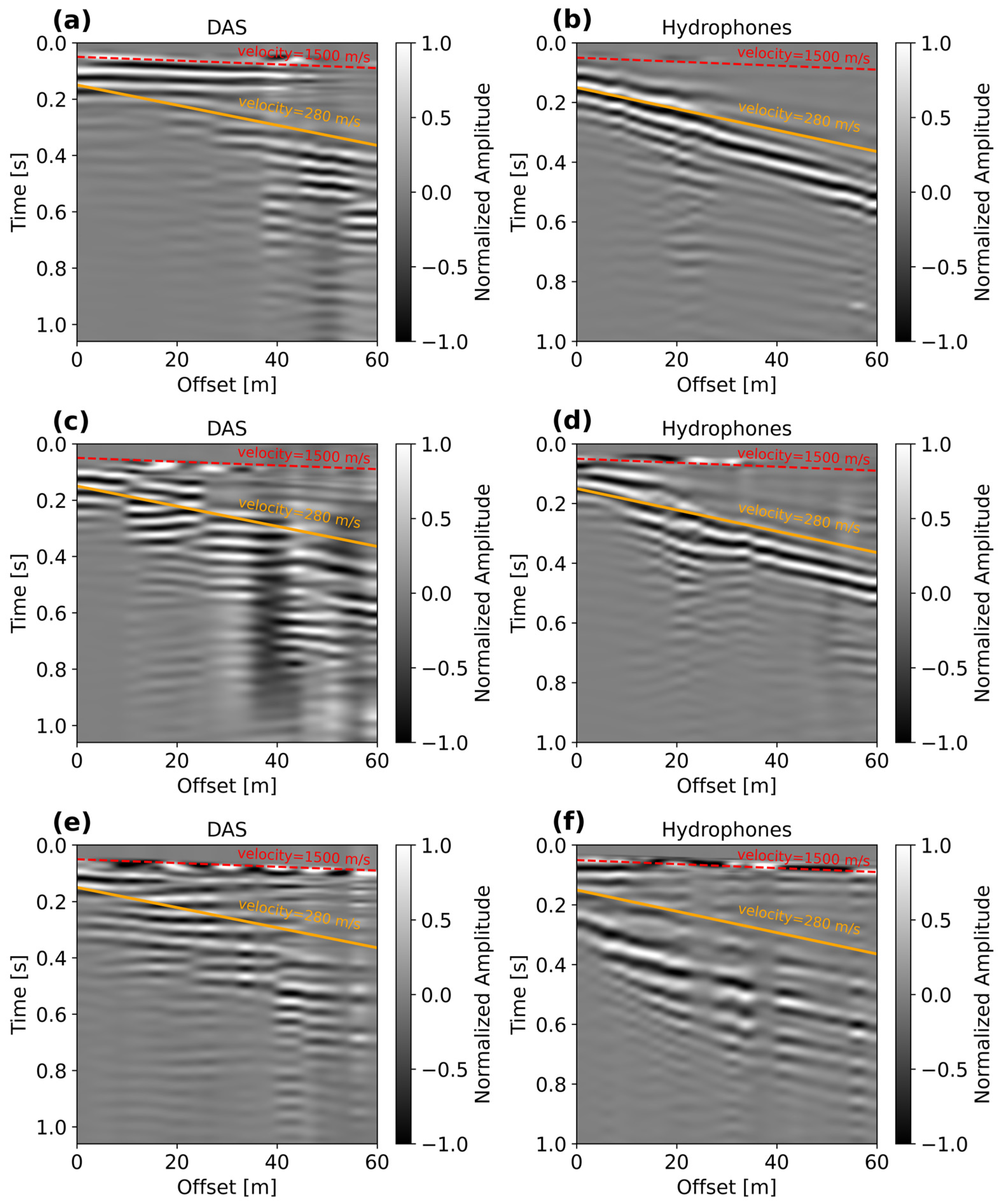 Recorded DAS and hydrophones records are generated using source position with respect to hydrophone channels: (a,b) 5, (c,d) 26, and (e,f) 48. For reference, the speed of water (1500 m/s) and the dominant apparent slow-velocity Scholte waves (280 m/s) are indicated in red and orange, respectively.