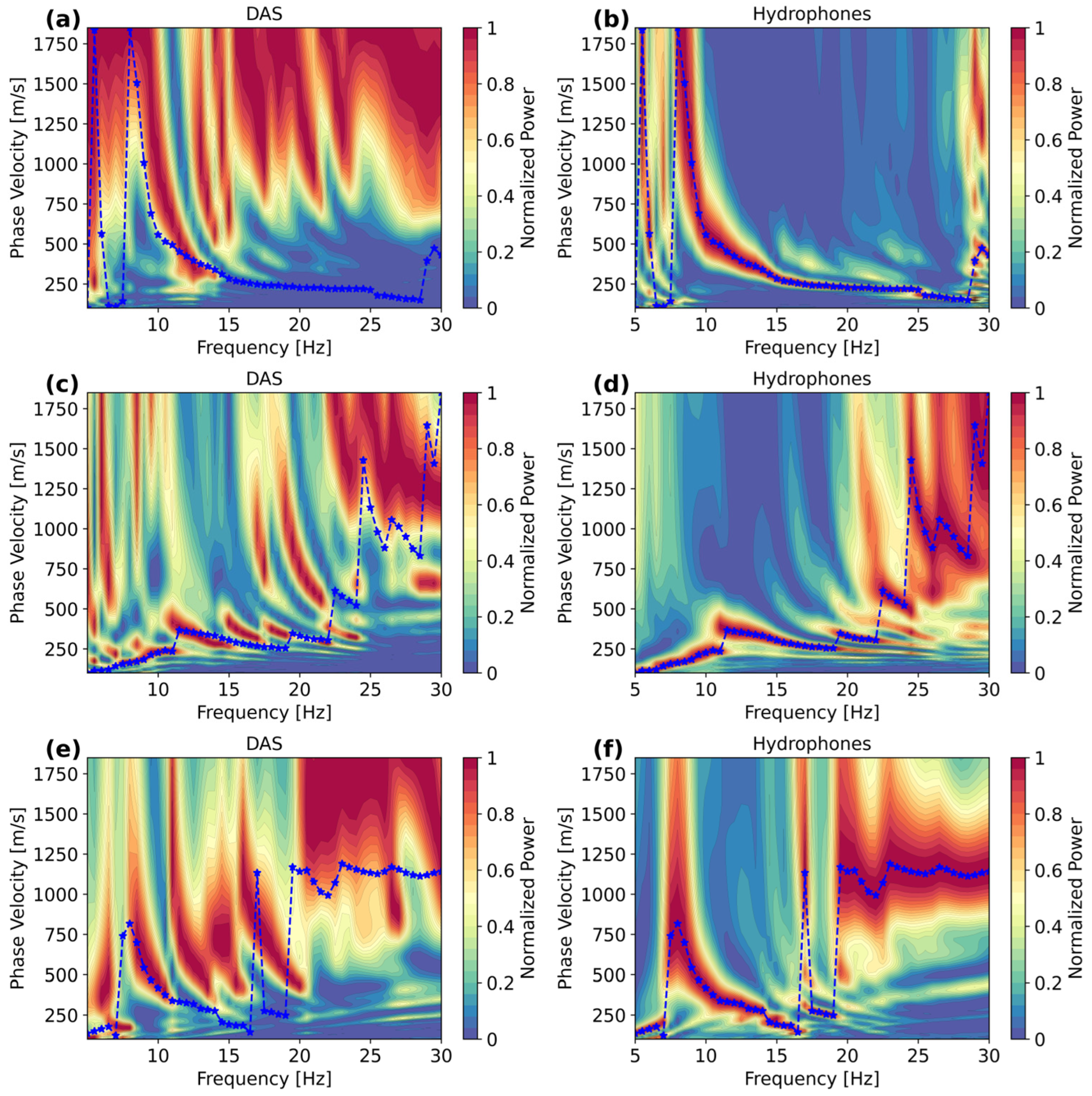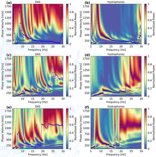 Phase velocity spectra from DAS and hydrophone records with sources at hydrophone numbers: (a,b) 5, (c,d) 26, and (e,f) 48. The blue lines are the selected maxima for each frequency in the hydrophone dataset, which, for comparison, are also plotted on the DAS spectra. The blue stars represent the maximum energy per frequency.
