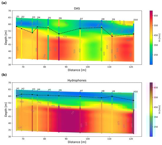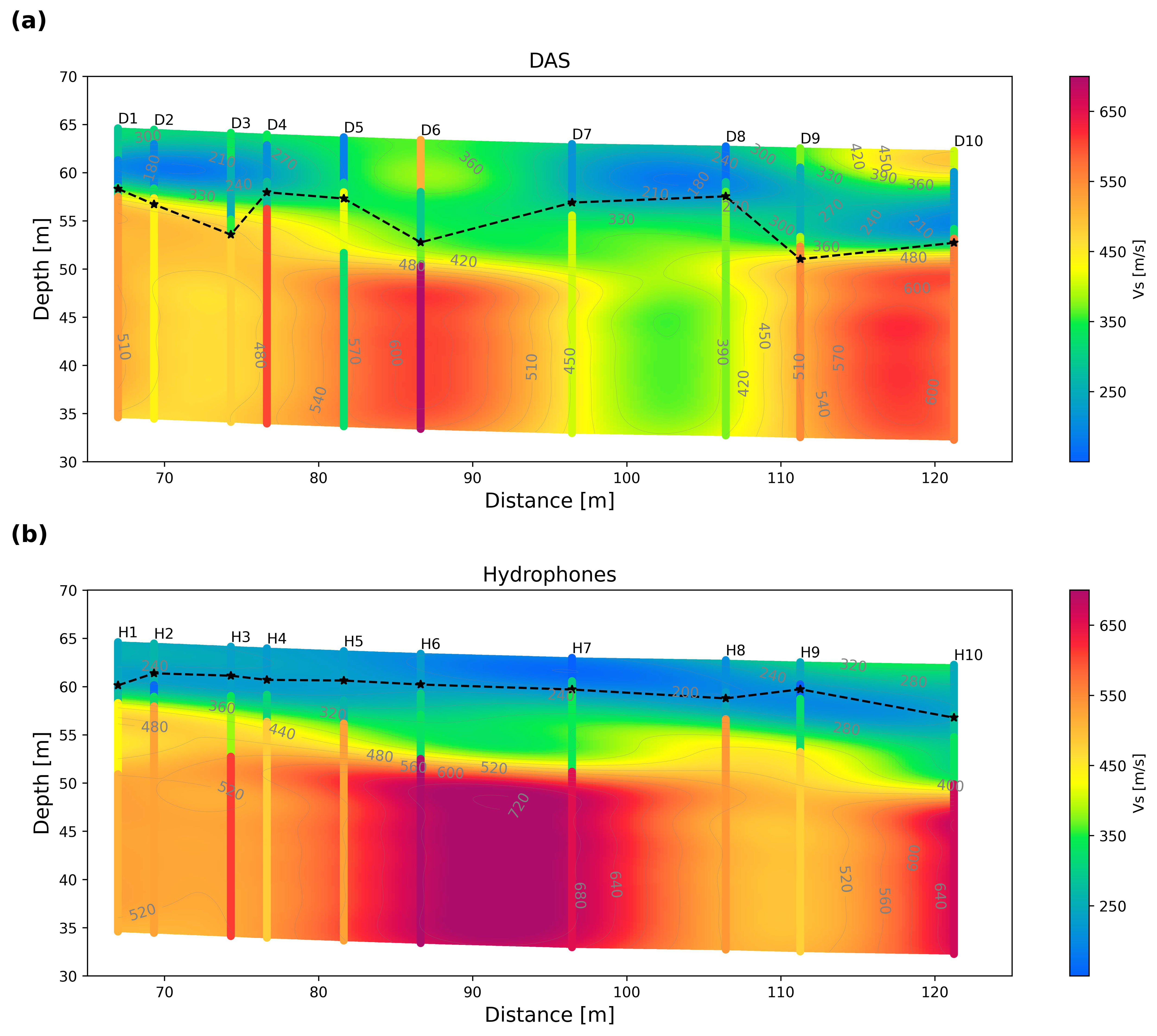 Retrieved S-wave velocity cross-section for (a) DAS and (b) hydrophone data. The S-wave velocity cross-section is computed after interpolating both DAS and hydrophone 1D profiles, indicated as D1–D10 (DAS) and H1–H10 (hydrophones). The black dashed line represents the minimum resolvable depth based on the minimum wavelength measured. The stars indicate the position of the 1D profiles within the H_min curve.