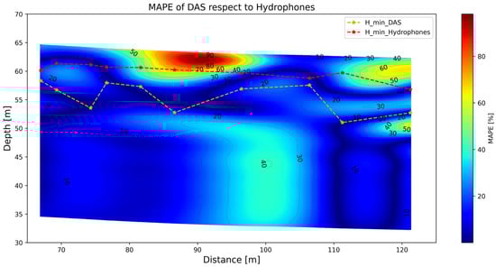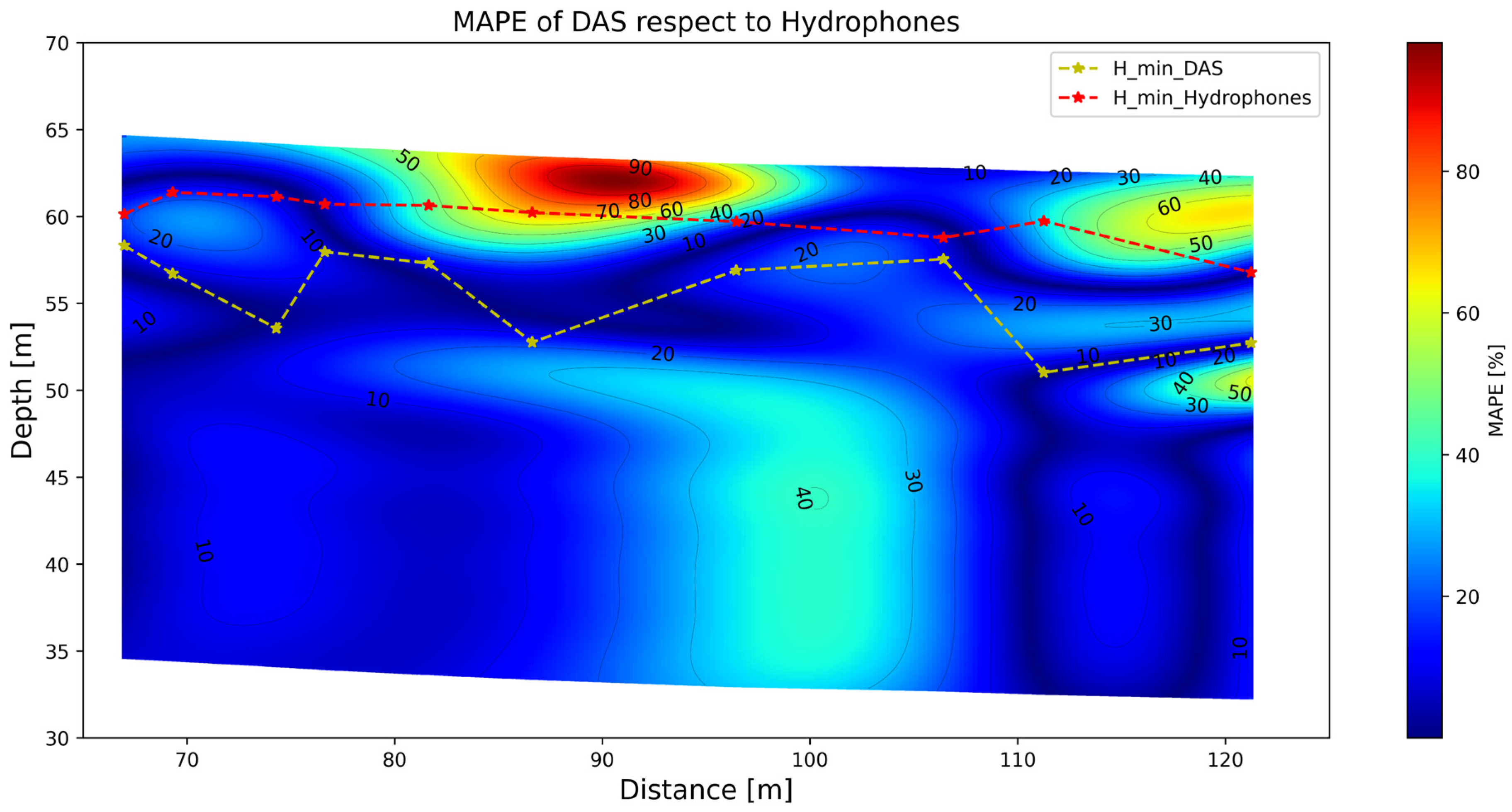 Mean absolute percentage error (MAPE) of the interpolated DAS results compared to the hydrophone inversion. Minimum depth of exploration (H_min) resolved with both DAS and hydrophone systems are indicated by discontinuous red and yellow lines.